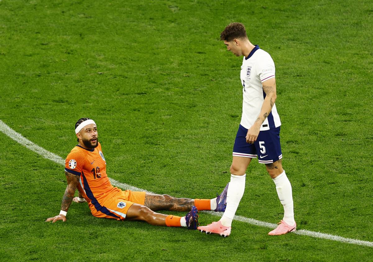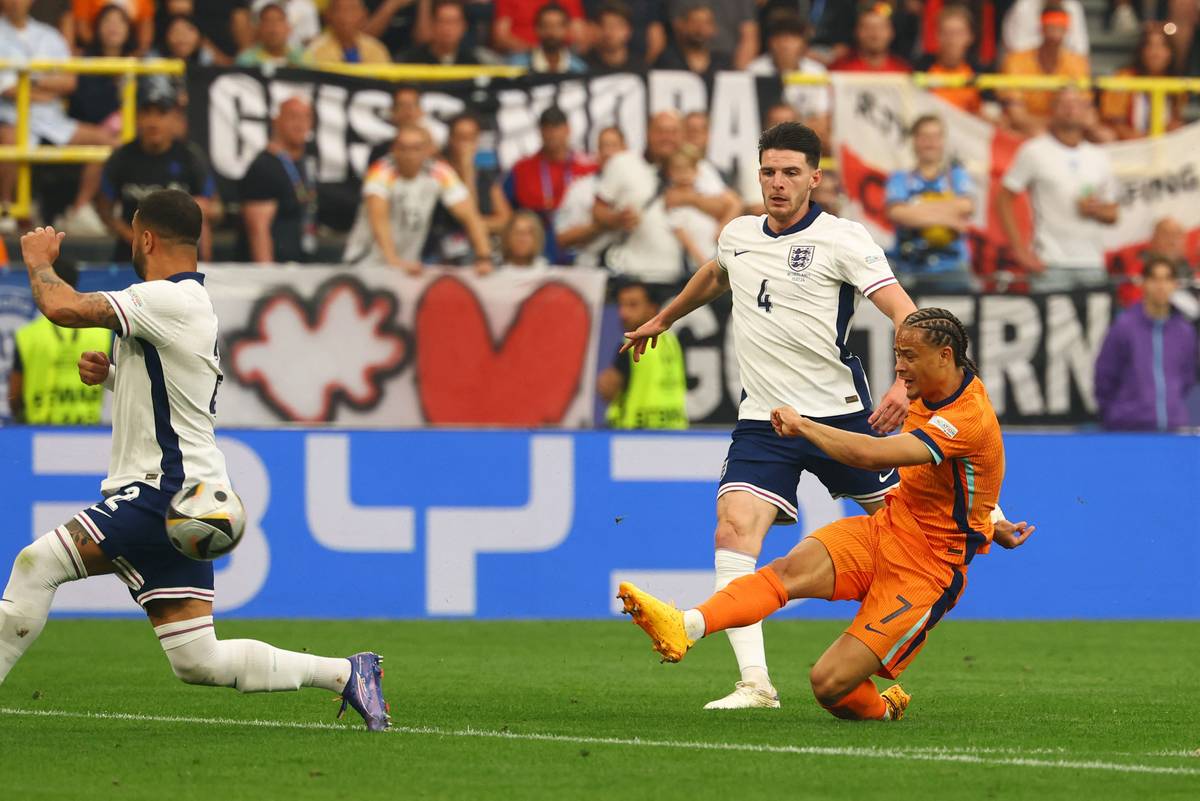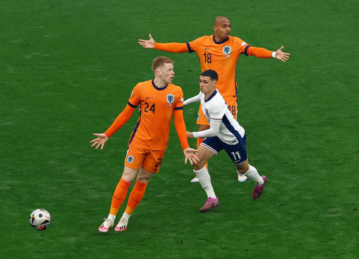 Phil Foden už překonal nizozemského gólmana, toho však na brankové čáře zastoupil Dumfries a změnu skóre nepřipustil