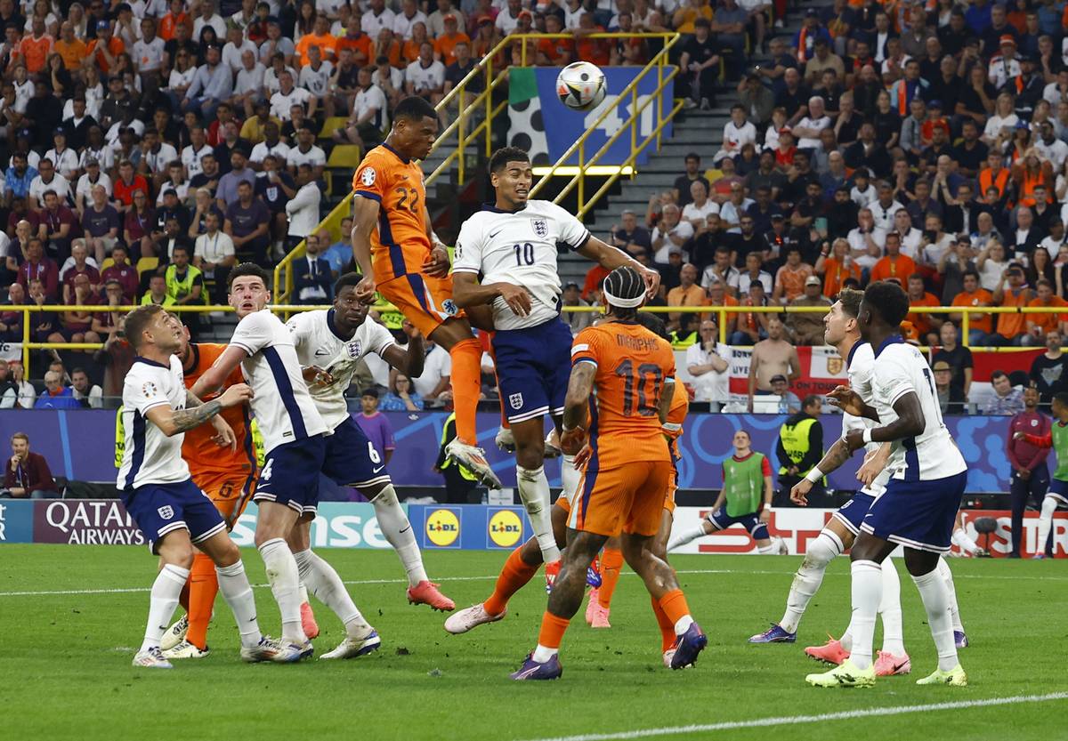Dumfries (22) se fantasticky po rohovém kopu vyšrouboval do vzduchu ale napálil pouze břevno