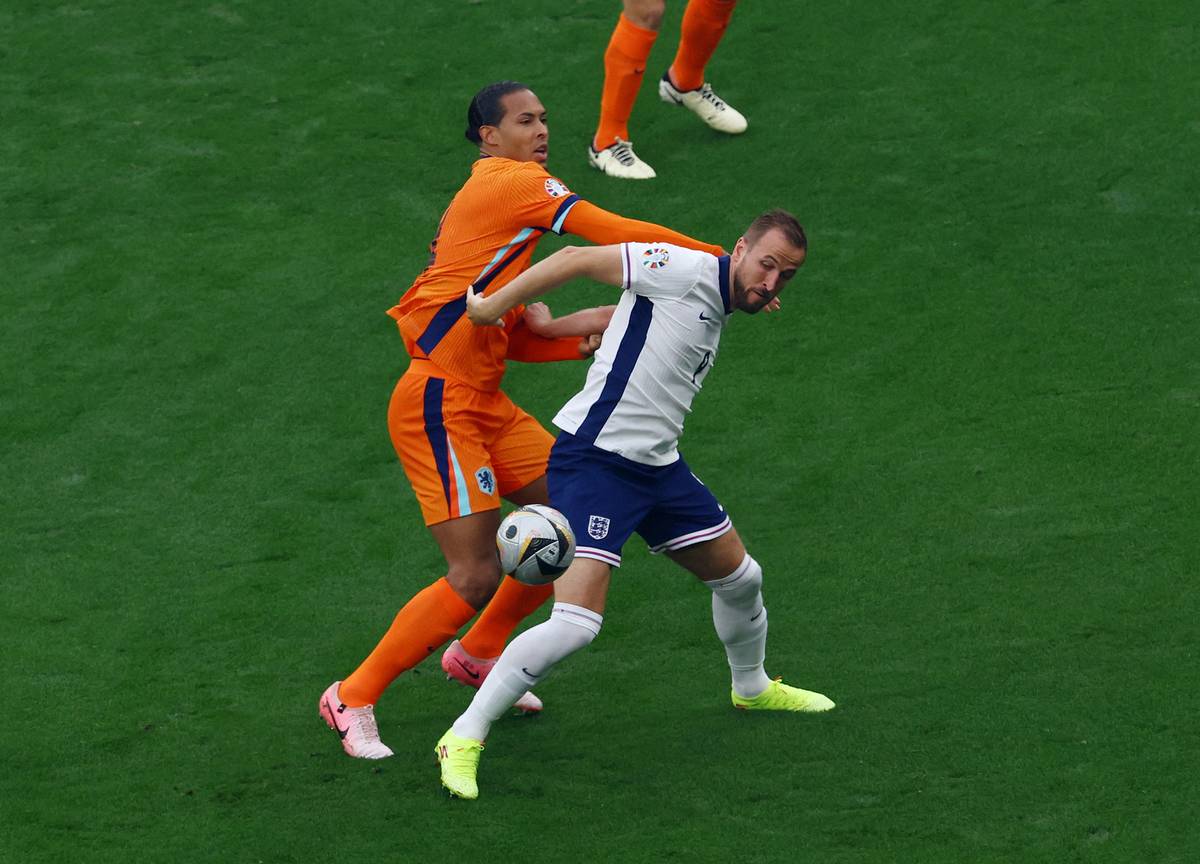 Anglický útočník Harry Kane (v bílém) se v souboji kapitánů s Virgilem van Dijkem snažil udržet míč ve složité pozici