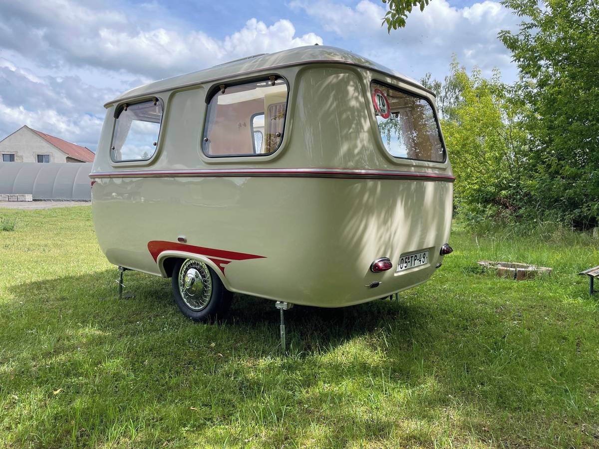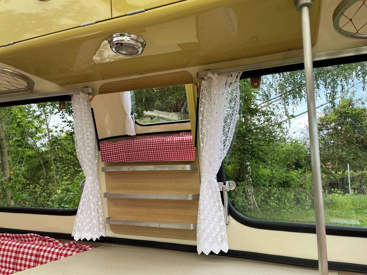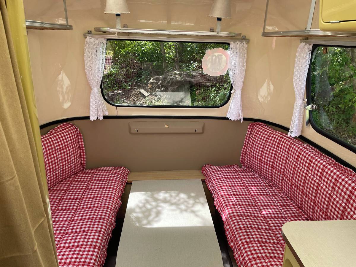 Vždyť uvnitř spíš připomíná přívěs pro panenky. Přesto se tu na lavici, která se rozloží, mají vyspat tři osoby, na lavici vpředu pak čtvrtá. Karavan měl posloužit rodině s dvěma dětmi.
