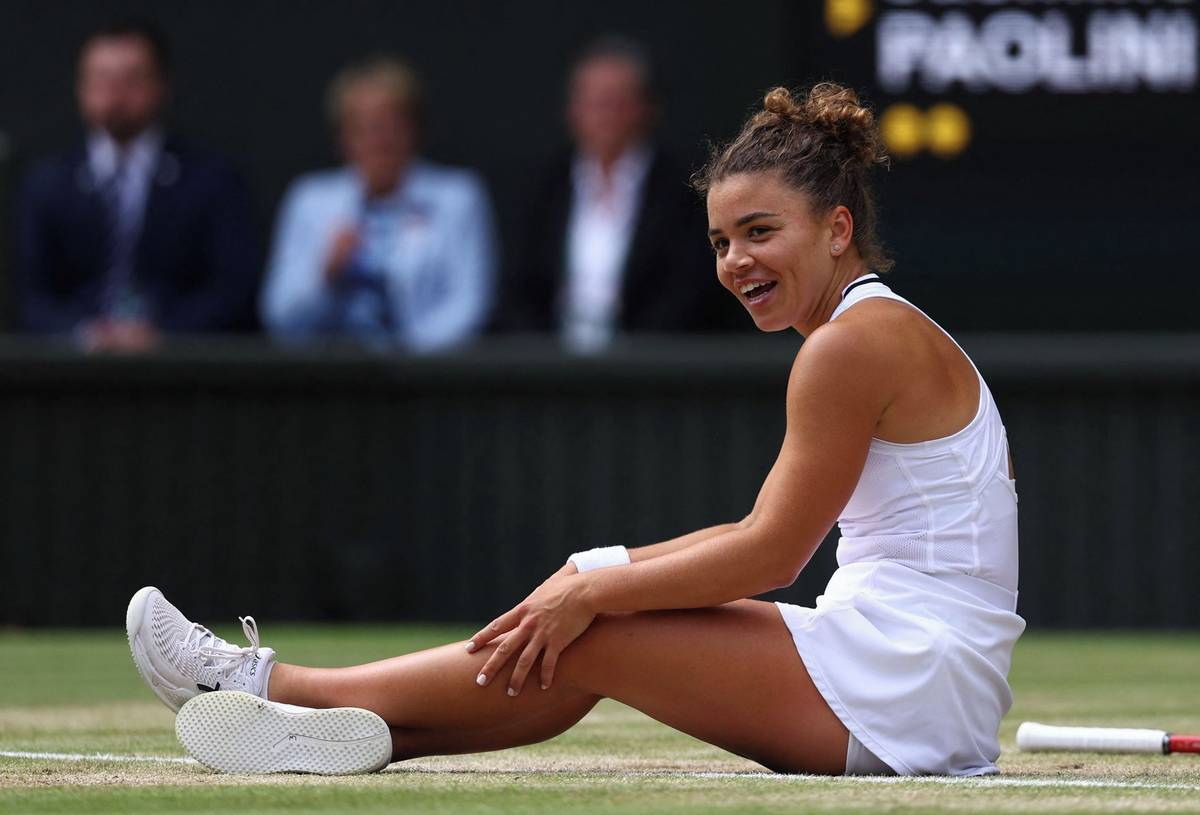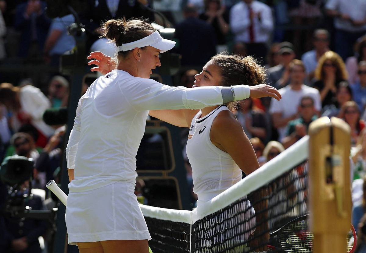 Barbora Krejčíková se objímá s poraženou finalistkou Jasmine Paoliniovou. Obě tenistky předvedly ve finále dobrý výkon, rozhodly ale v závěru pevnější nervy zkušenější české hráčky. Krejčíková už je dvojnásobnou grandslamovou šampionkou ve dvouhře, navázala na titul z Roland Garros z roku 2021.