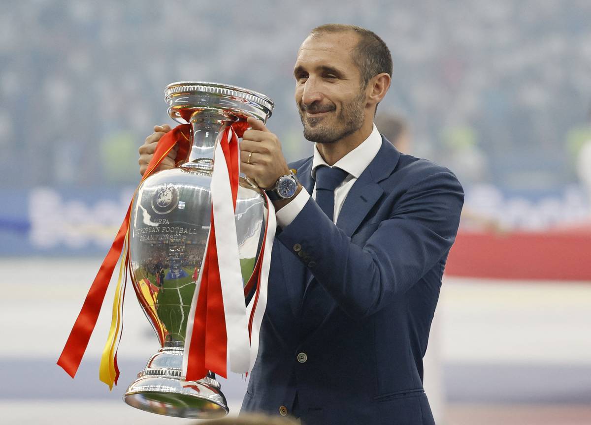 Italský mistr Evropy Giorgio Chiellini přinesl na hrací plochu trofej pro vítěze Eura