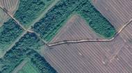 A tady celá oblast z větší dálky. Linie zákopů prochází zhruba středem snímku, napravo od středu můžete vidět místo zobrazené na prvním snímku, nalevo úsek z druhého snímku. Americký Institut pro studium války s odvoláním na satelitní snímky uvedl, že Rusko se narychlo snaží opevnit linii vzdálenou 16 kilometrů od ukrajinské frontové linie v Kurské oblasti.