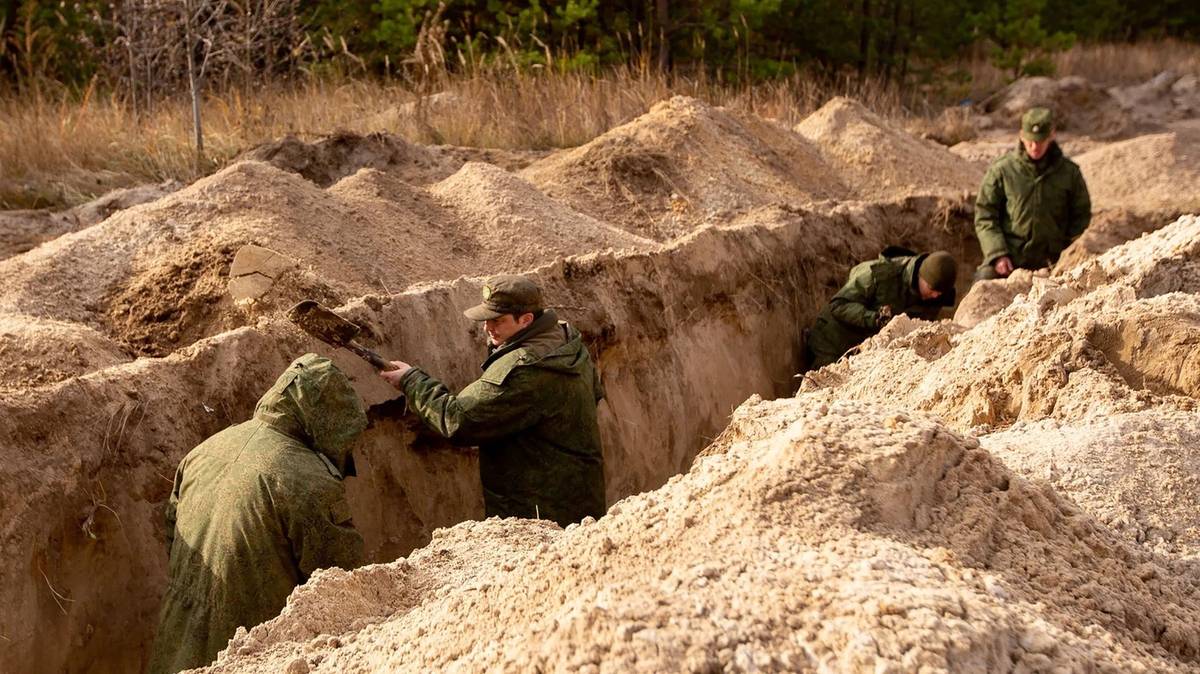 Inzeráty hledají dělníky a pomocné dělníky bez zkušeností, ale také obsluhu bagrů, a slibují, že práce bude „mimo bojovou zónu“ a „bez nebezpečí“. (Snímek kopajících v Kurském regionu ze 13. srpna.)