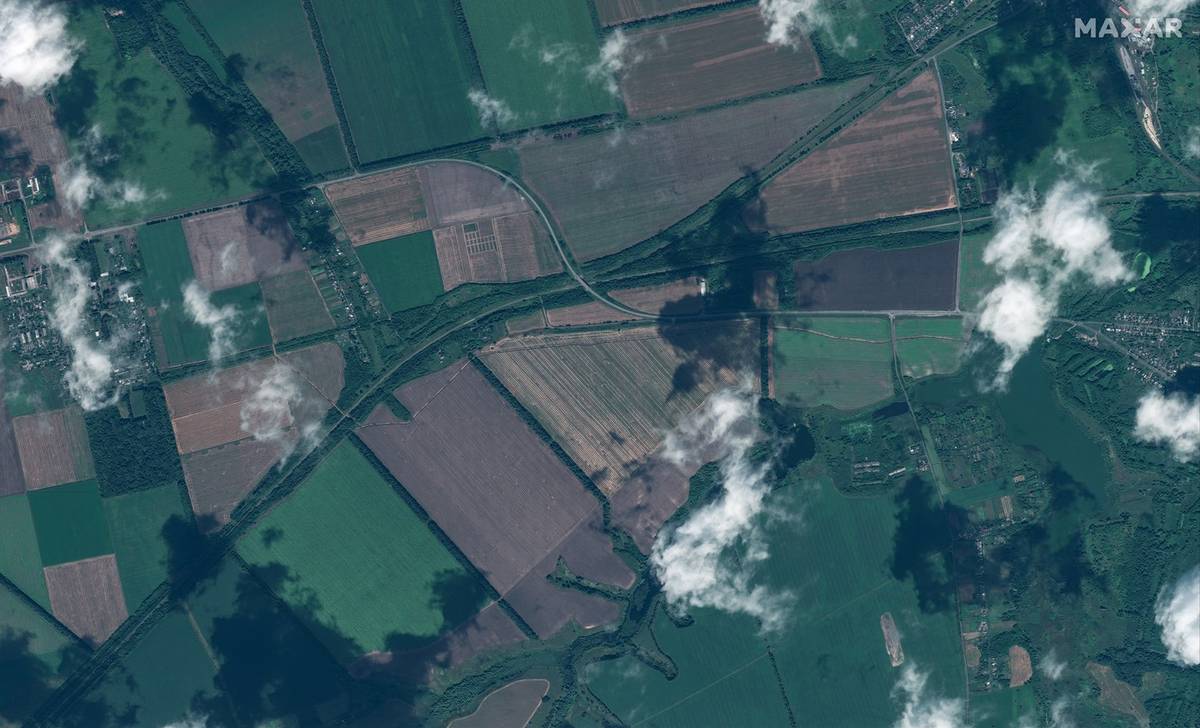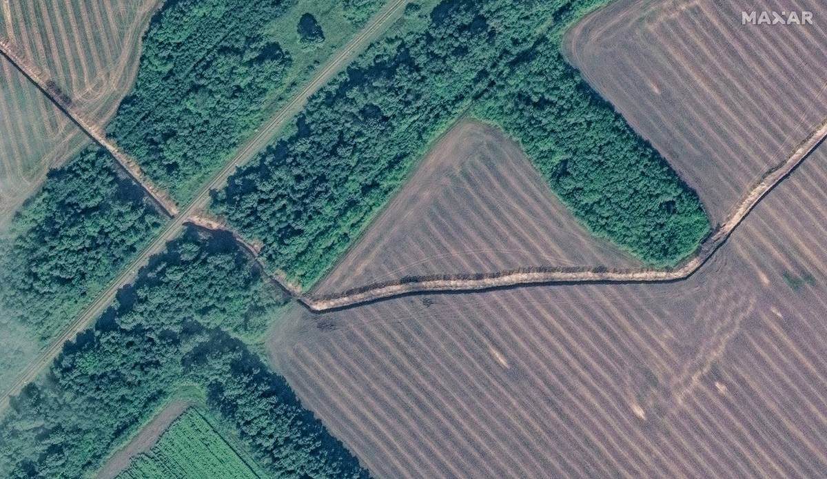 (Satelitní snímek rychle budovaného zákopu v Kurské oblasti, 13. srpna.)