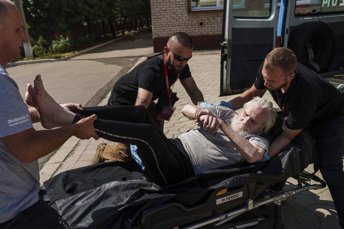 (Dobrovolníci přesouvají staršího invalidního muže na nosítkách během evakuace v Pokrovsku, Doněcká oblast, 19. srpna.)