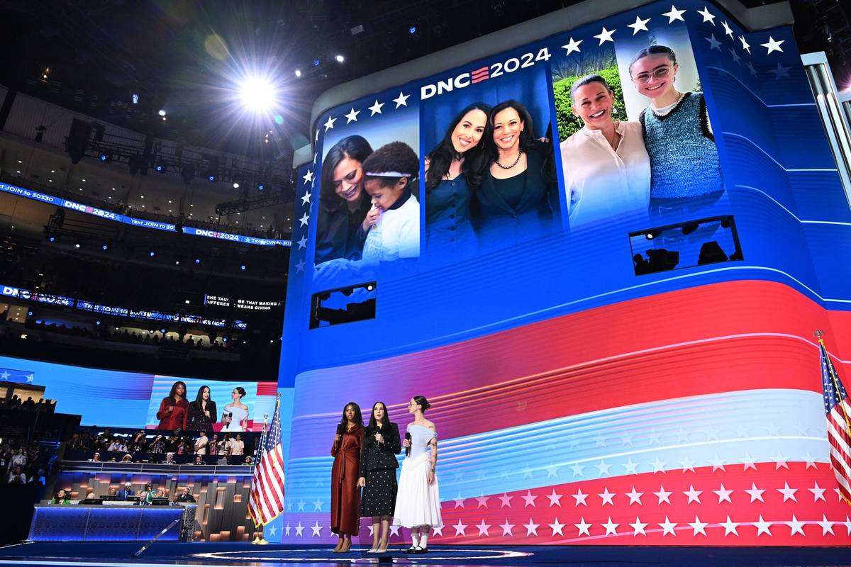 „Ne vždycky jsem rozuměla svým pocitům, ale Kamala tam vždycky byla pro mě, ať se dělo cokoli. Trpělivě se starala a vždycky mě brala vážně,“ dodala Emhoffová. Spolu s ní vystoupily neteř Harrisové Meena Harrisová (uprostřed) a její kmotřenka Helena Hudlinová, jejíž matka političku seznámila s manželem. (Demokratický sjezd v Chicagu, 22. srpna).