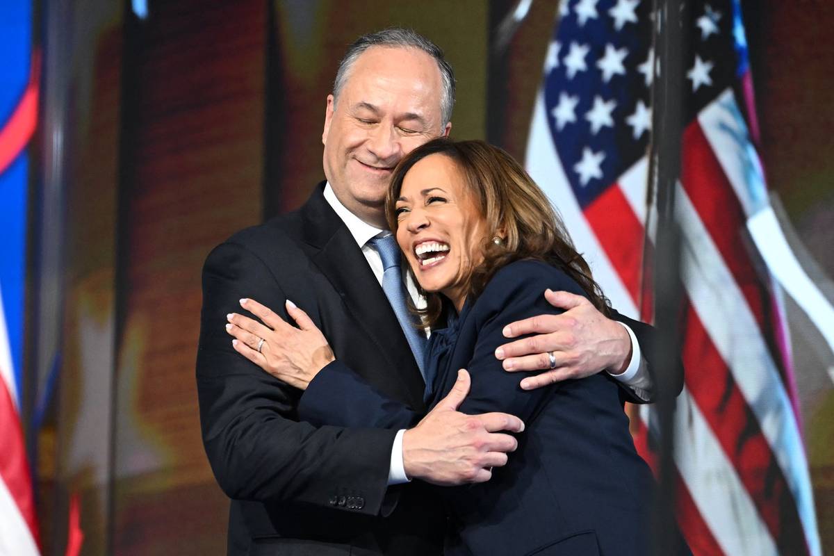 Demokraté na sjezdu stejně jako předtím republikáni zdůrazňovali rodinné hodnoty, byť příbuzní Kamaly Harrisové na něm měli o něco méně výraznou roli než rodina Donalda Trumpa na republikánském kongresu. (Doug Emhoff objímá manželku po projevu, kterým uzavřela sjezd, 22. srpna).