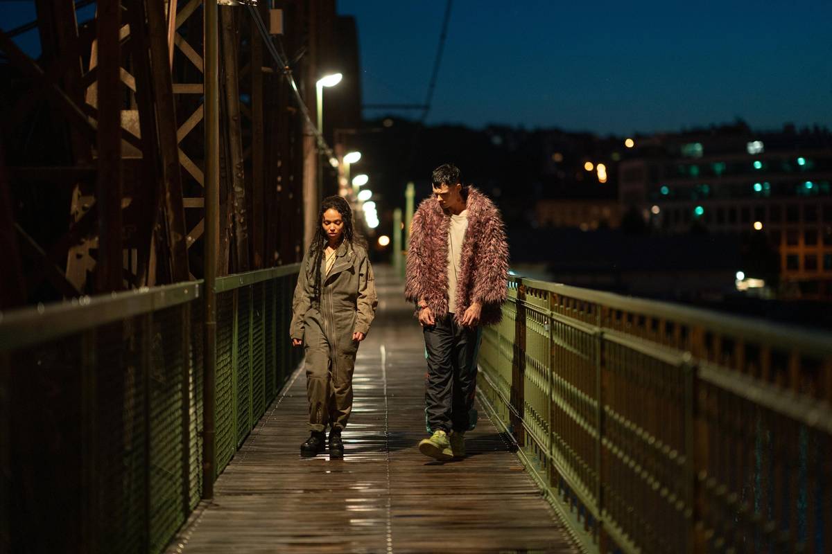 FKA Twigs a Bill Skarsgård na pražském Železničním mostě.