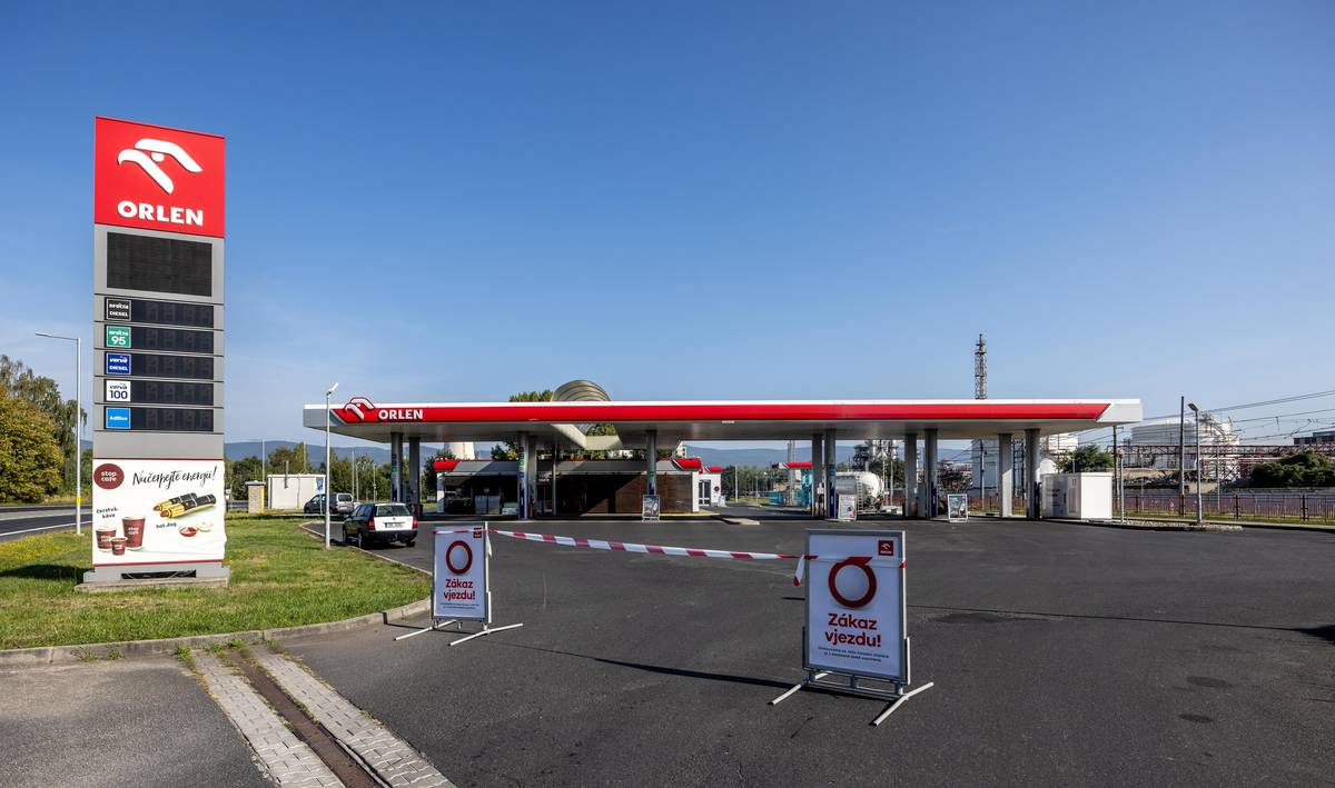 Uzavřená čerpací stanice poblíž závodu společnosti Orlen Unipetrol.
