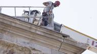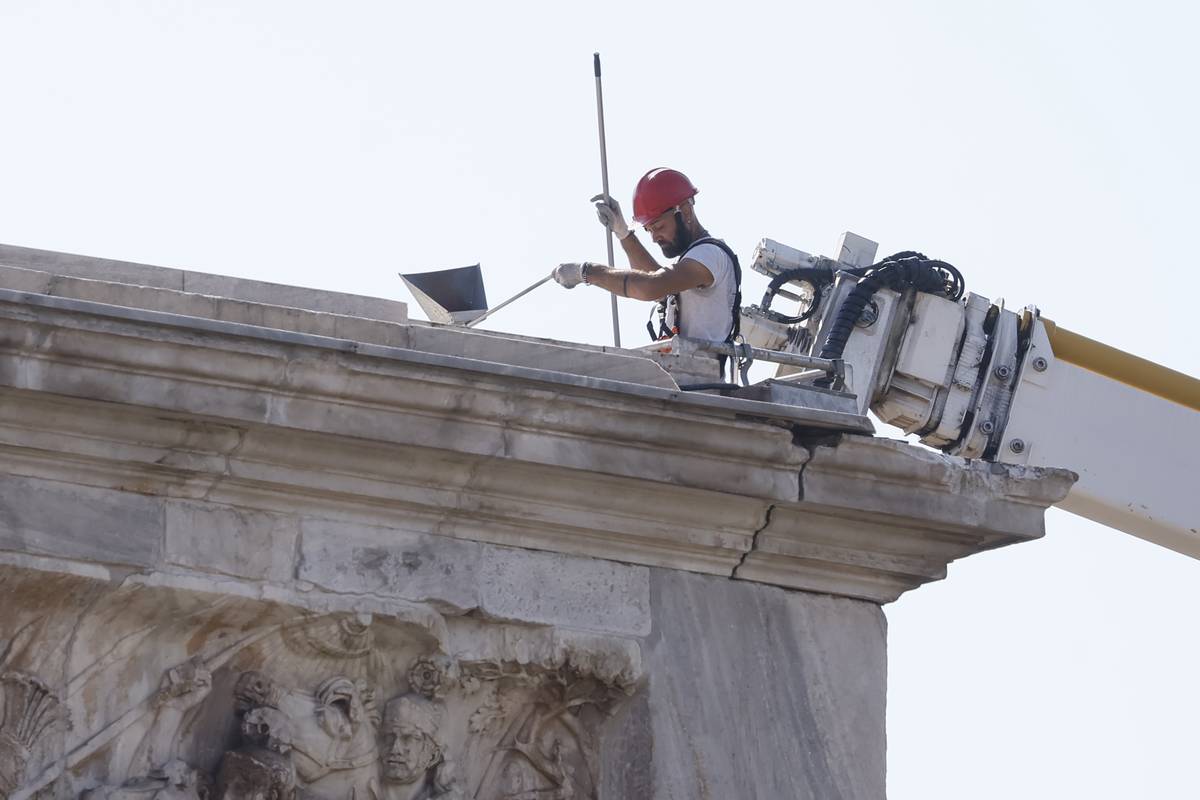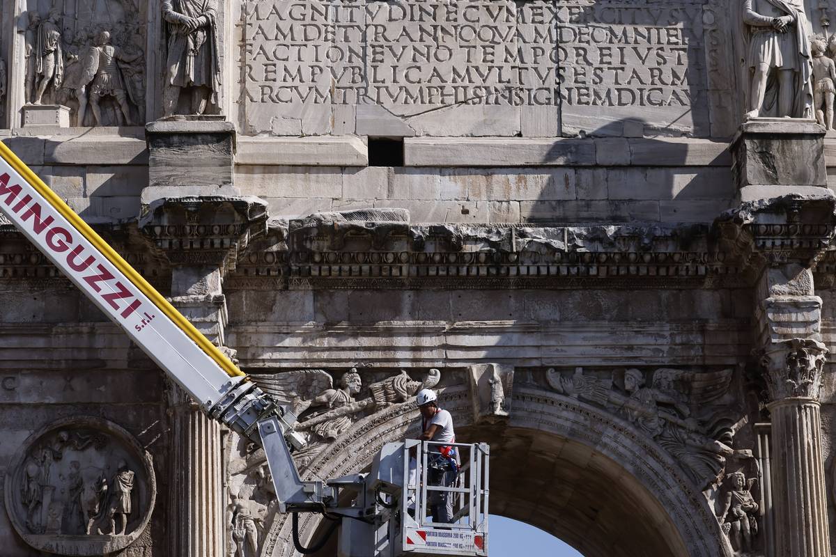 Pracovník archeologického parku, který spravuje Koloseum a jeho okolí, zjišťuje dodatečné škody na Konstantinově oblouku, 4. září 2024.