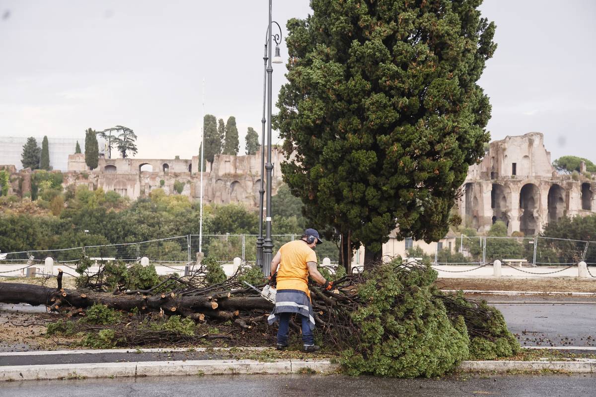 Odstraňování následků silné bouře: Stromy popadaly například před největším antickým cirkem Říma (Circo Massimo / Circus Maximus); svého času dokázal pojmout více než 150 tisíc diváků. Foceno v úterý 3. září.