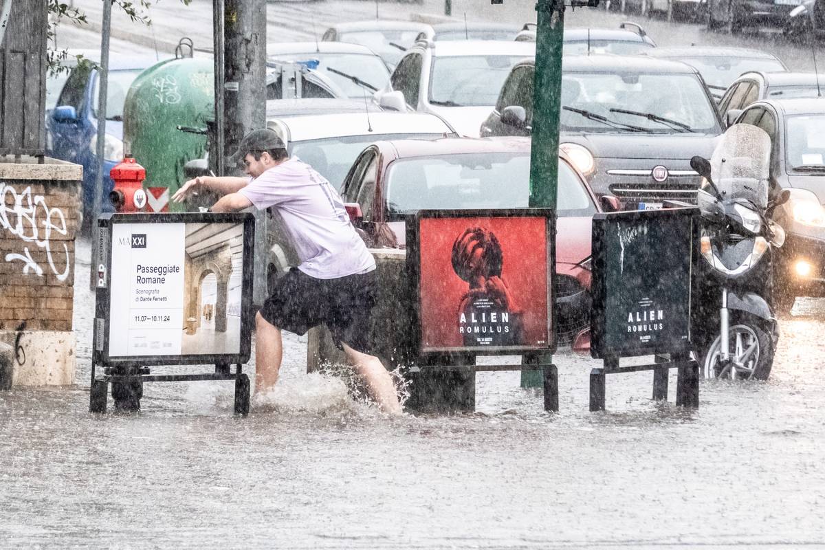 „Zatímco kolabovala doprava kvůli zaplaveným silnicím, turisté, mnozí v šortkách a krátkých rukávech, hledali útočiště v barech,“ popisovala dění v Římě veřejnoprávní stanice RAI. (Na snímku římská čtvrť San Giovanni, 3. září 2024.)