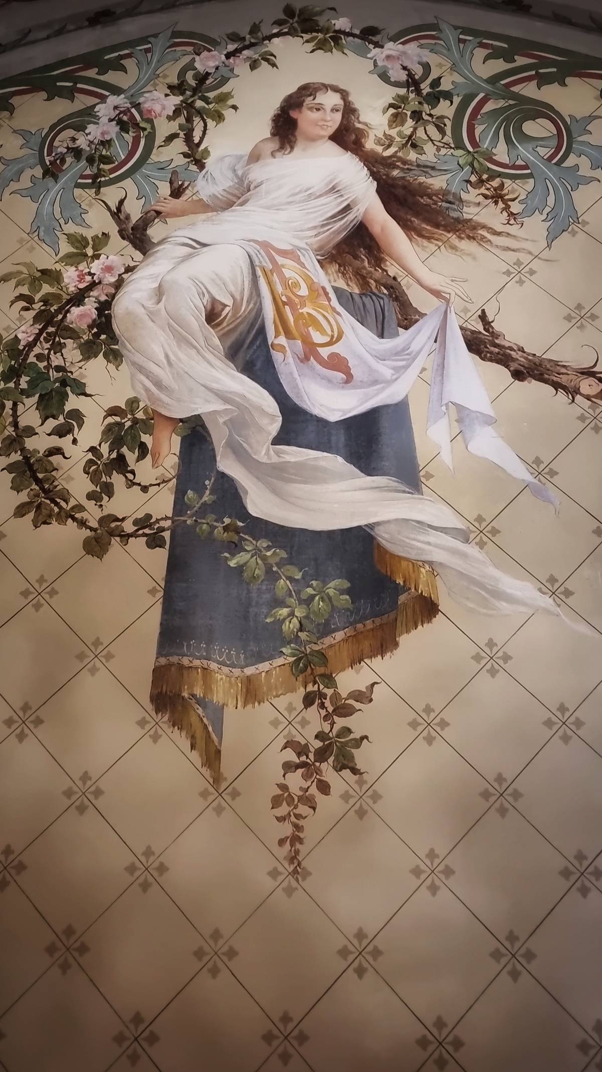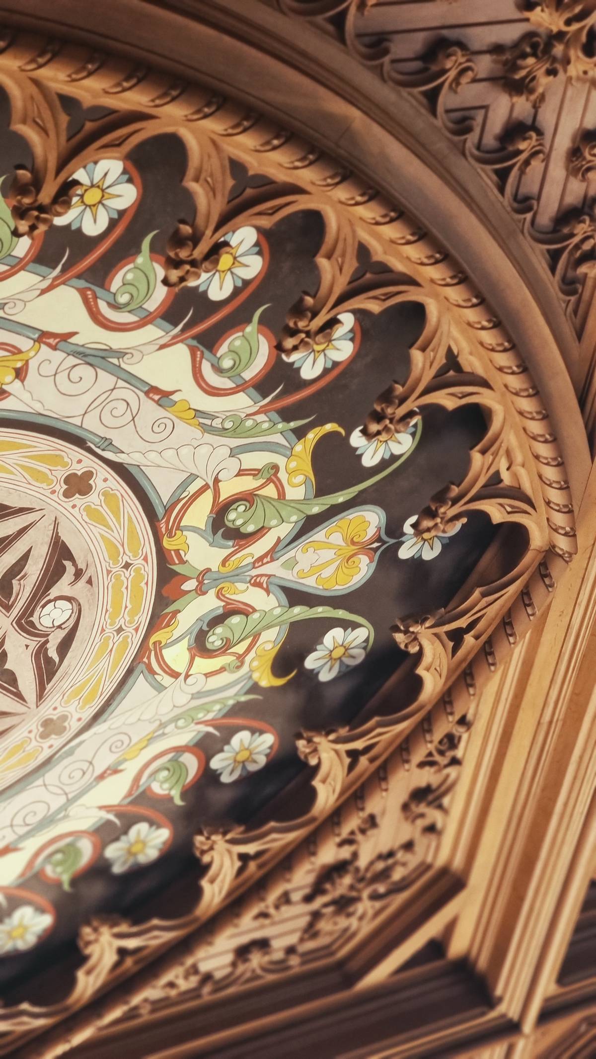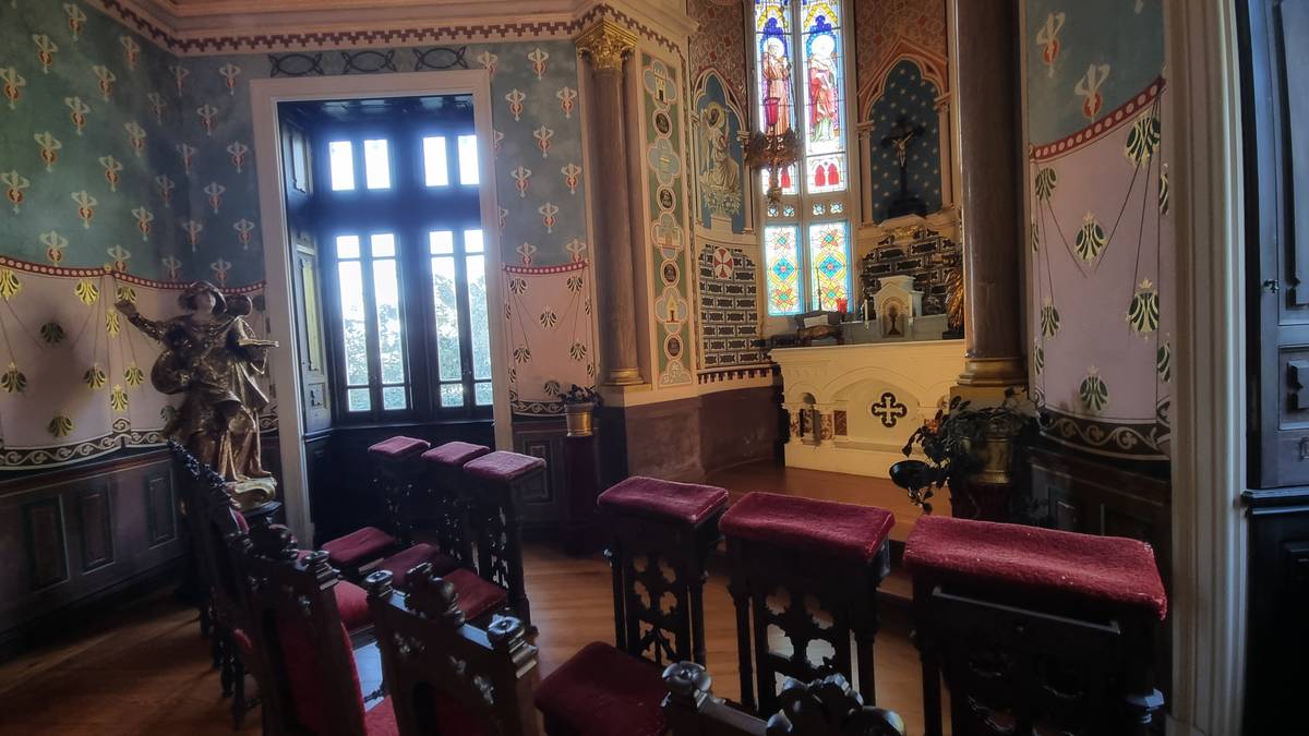 Interiér je bohatě zdobený. Dominuje mu mimo jiné dřevořezba.