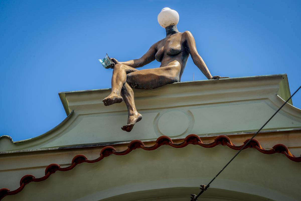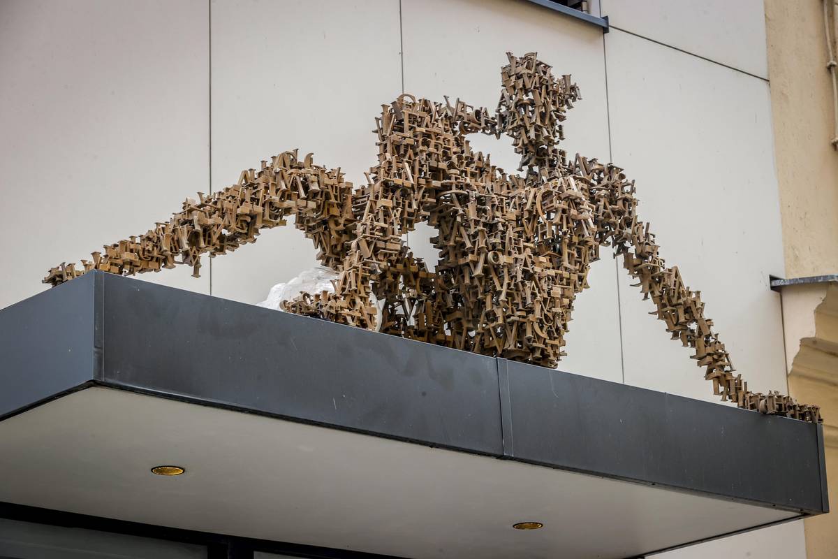 Na snímku H-A-V-E-L|2021. Socha ženy složená z písmenek zdobí vchod do Knihovny Václava Havla v Praze 1, Ostrovní 129/13.
