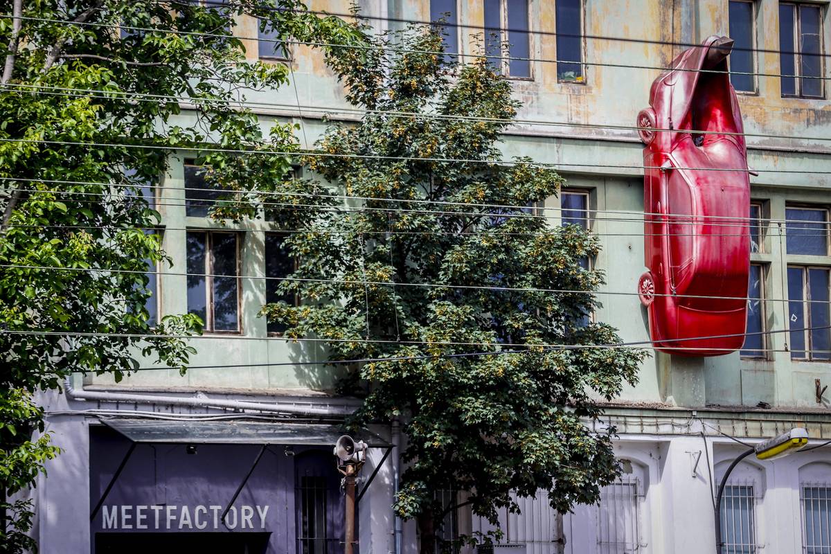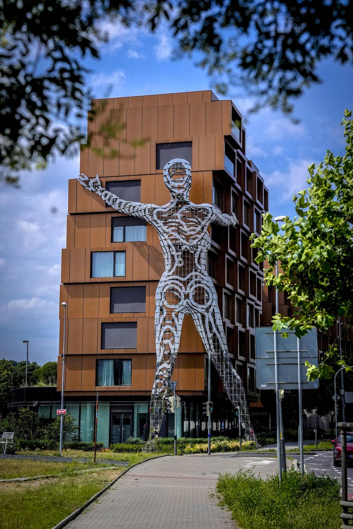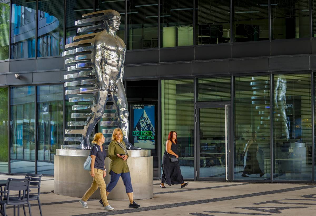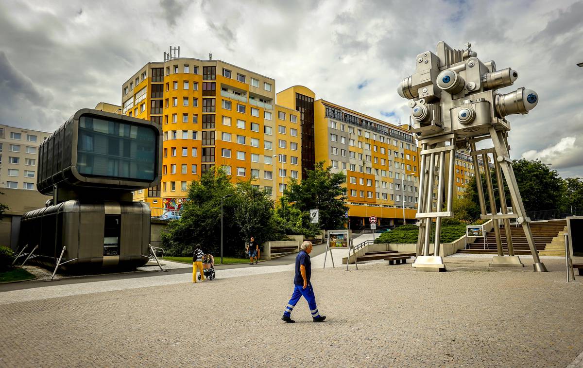 Na snímku socha Trifot. Jde o 12metrovou kráčející plastiku z dílny Davida Černého, která byla vytvořena přímo na míru galerii Czech Photo Centre. Vlevo se nachází dvoupatrový objekt (kavárna), jež připomíná hlavu a tělo psa. Dílo se jmenuje Cyberdog. Seydlerova ulice, Praha 5 – Stodůlky