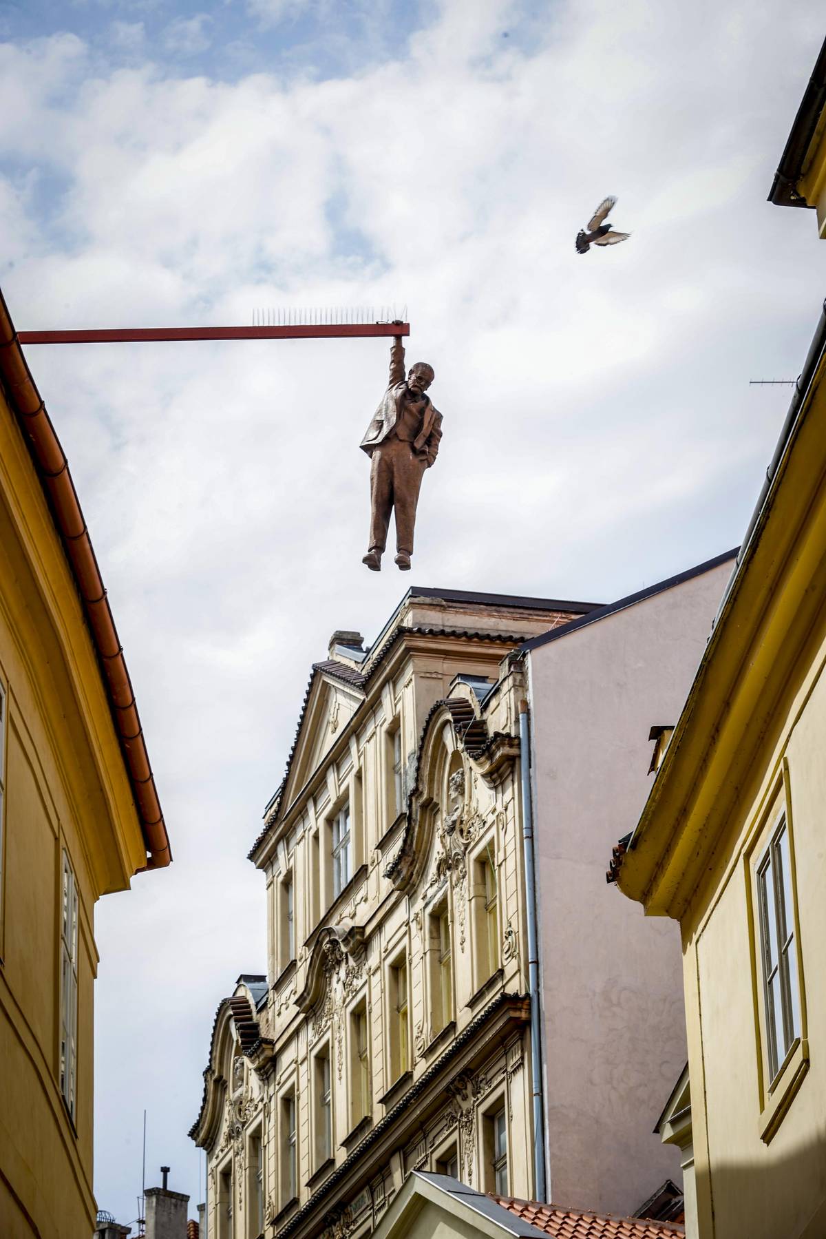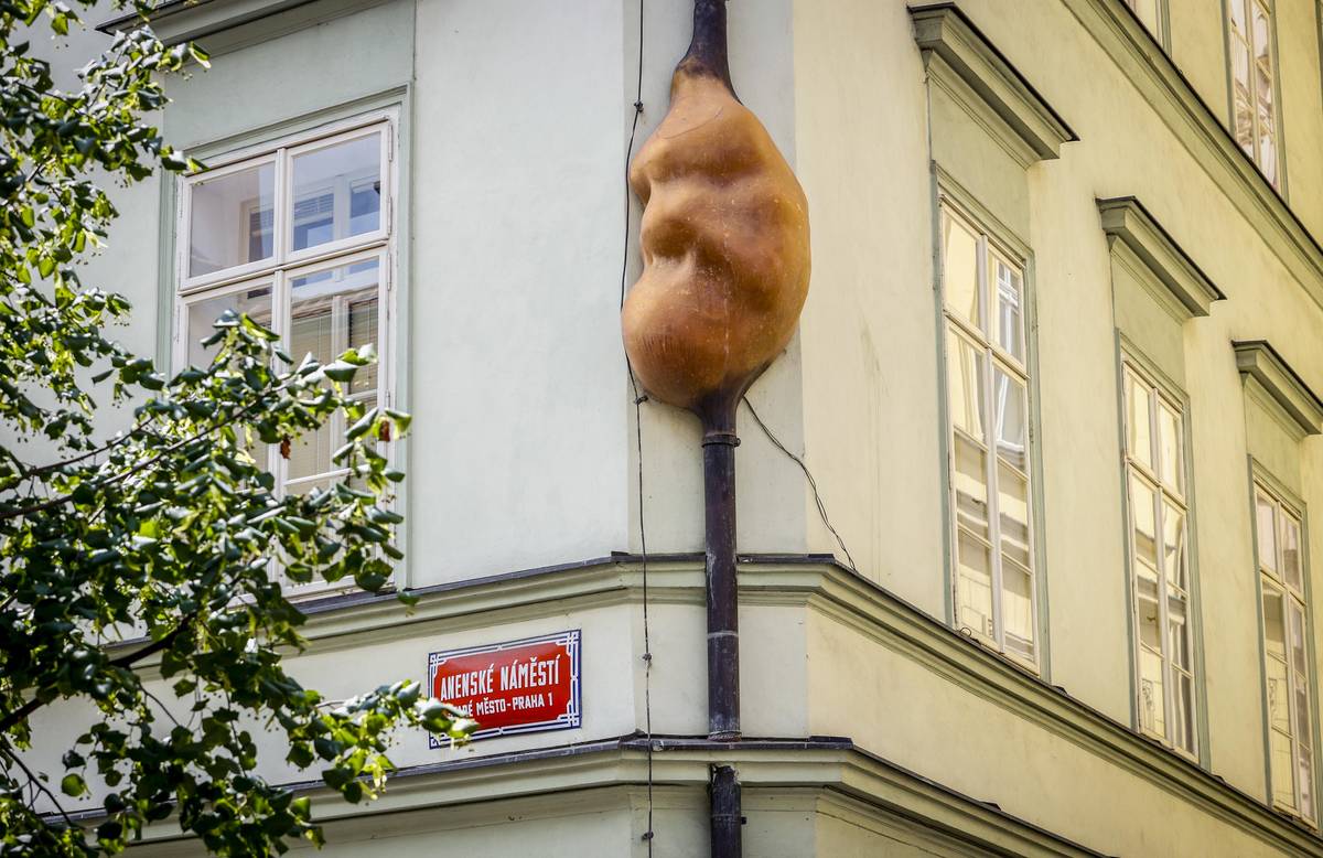 Na snímku VISELEC|1997. Socha z roku 1996 zobrazuje Sigmunda Freuda visícího za jednu ruku s druhou rukou v kapse. Černý se tou dobou zamýšlel nad příchodem nového tisíciletí a nad tím, co se v jeho průběhu stane. Husova ulice, Staré Město