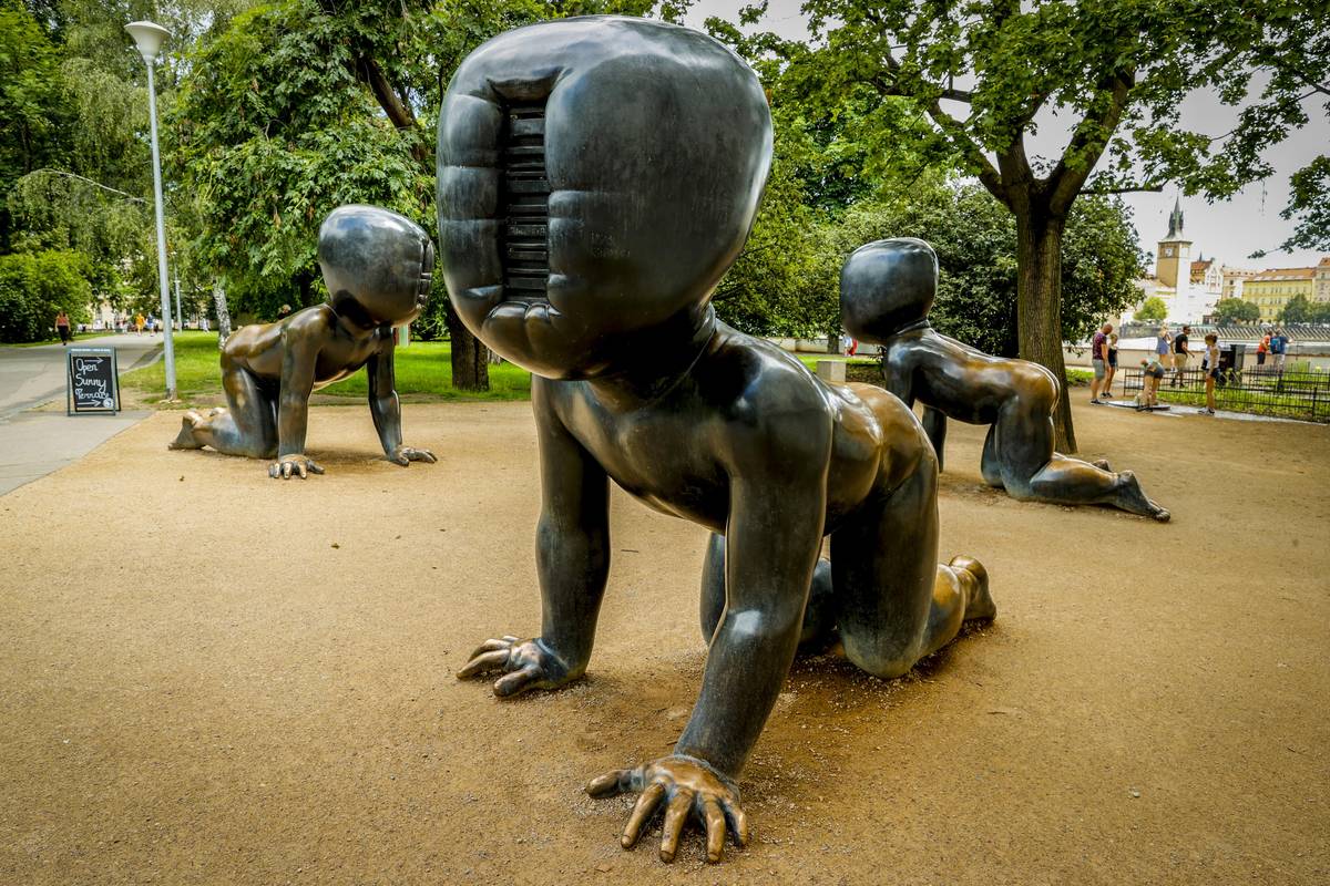 MIMINKA, KAMPA|2008. Na rozdíl od Žižkovské věže, kde tato obří miminka se zmutovaným obličejem prolézají ve výšce, si je můžete na Kampě prohlédnout pěkně zblízka a třeba se jich i dotknout!