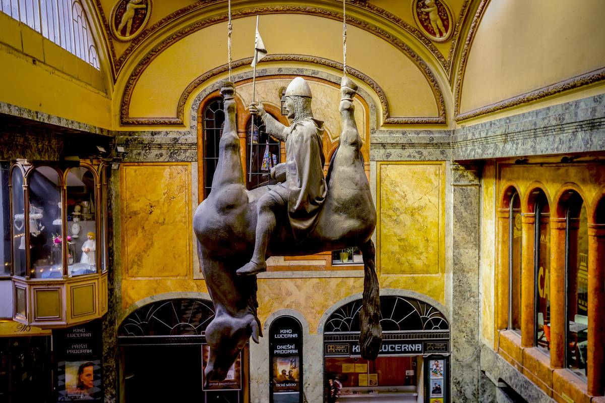 Sochy a plastiky Davida Černého v Praze, v Lucerně. Na snímku Sv. Václav|1999. Socha znázorňuje českého knížete a patrona, jak sedí na břiše mrtvého koně zavěšeného za nohy ke stropu. Kůň má hlavu svěšenou dolů a vyplazený jazyk, a připomíná tak ulovené zvíře.
