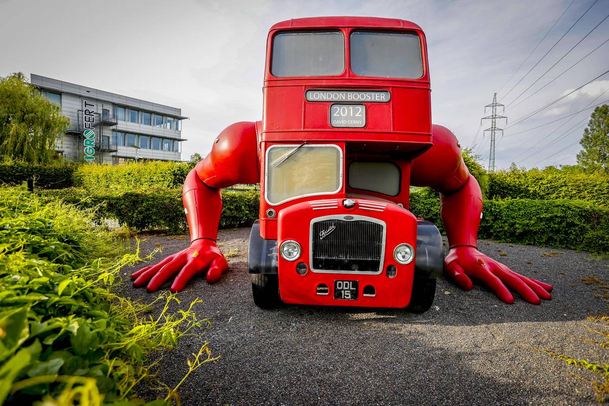 Sochy a plastiky Davida Černého v Praze. Na snímku The London Booster. Klikující autobus k olympiadě v Londýně si po ní koupil do areálu své firmy Agrofert na pražském Chodově Andrej Babiš.
