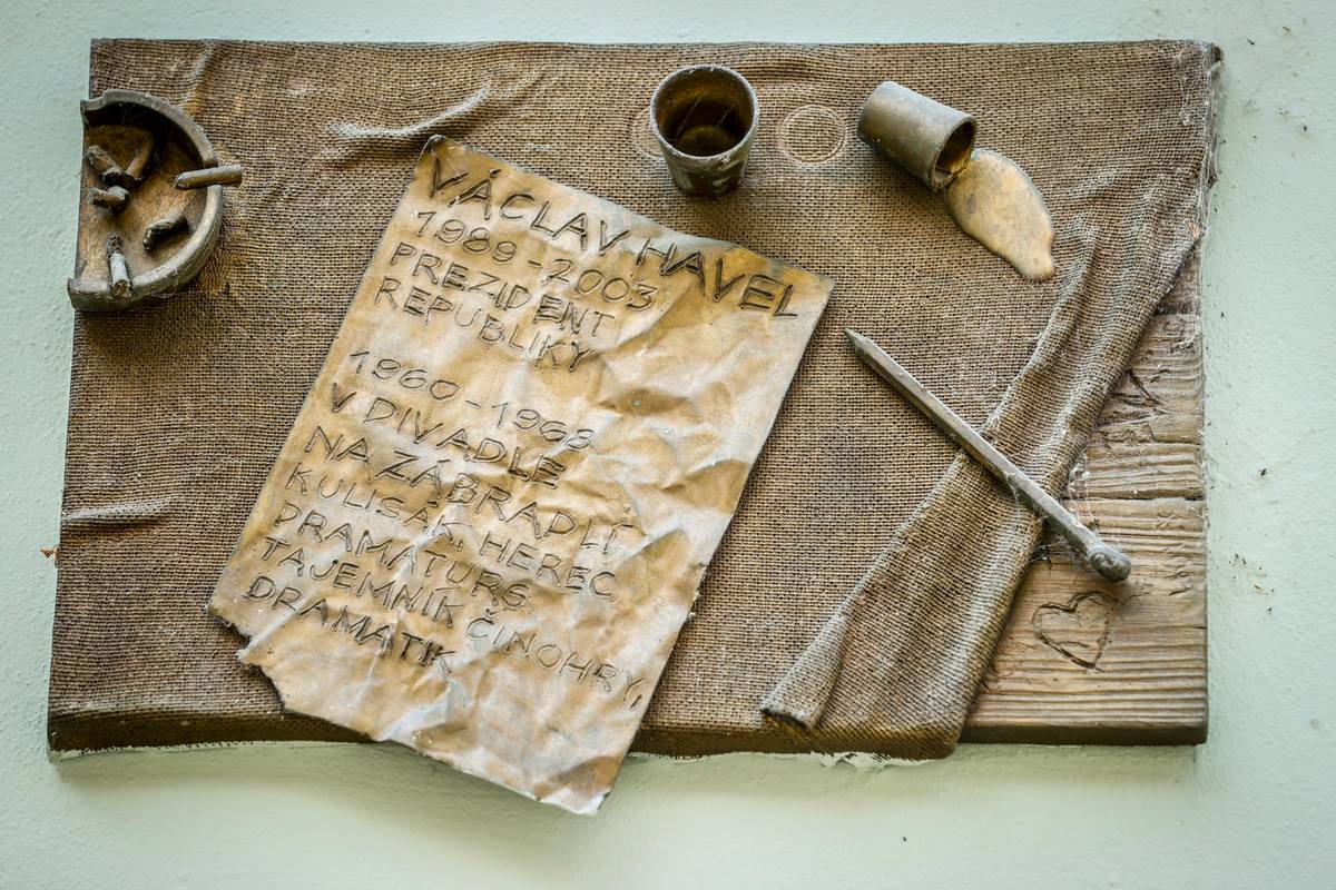 Na snímku PAMĚTNÍ DESKA VÁCLAVA HAVLA|2012. Vzpomínku na prezidenta najdete rovněž na fasádě Divadla na zábradlí, kde v letech 1960 až 1968 pracoval jako kulisák, herec, dramaturg, tajemník činohry a dramatik. Na desce je vyobrazený popelník s nedopalky cigaret, dvě sklenky a tužka, jejíž konec zdobí místo gumy Havlova miniaturní busta