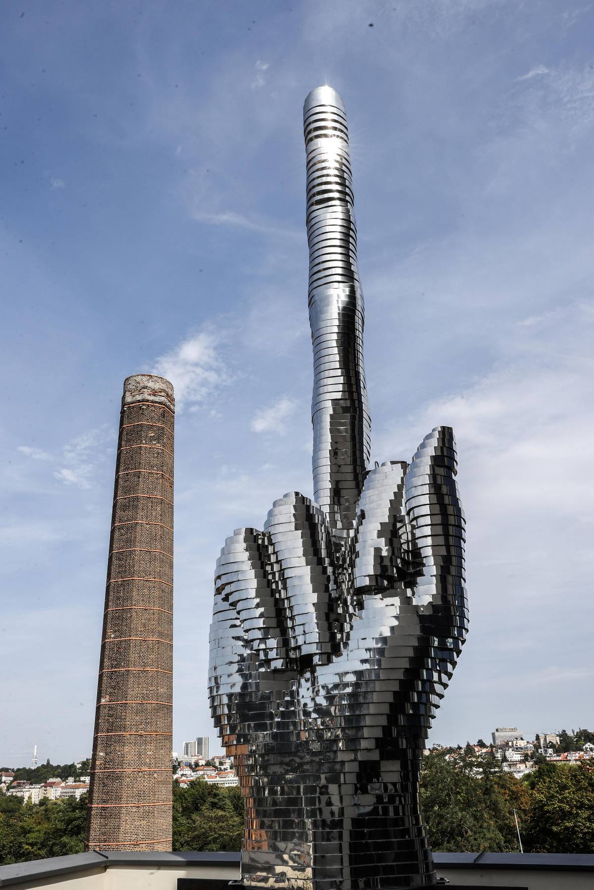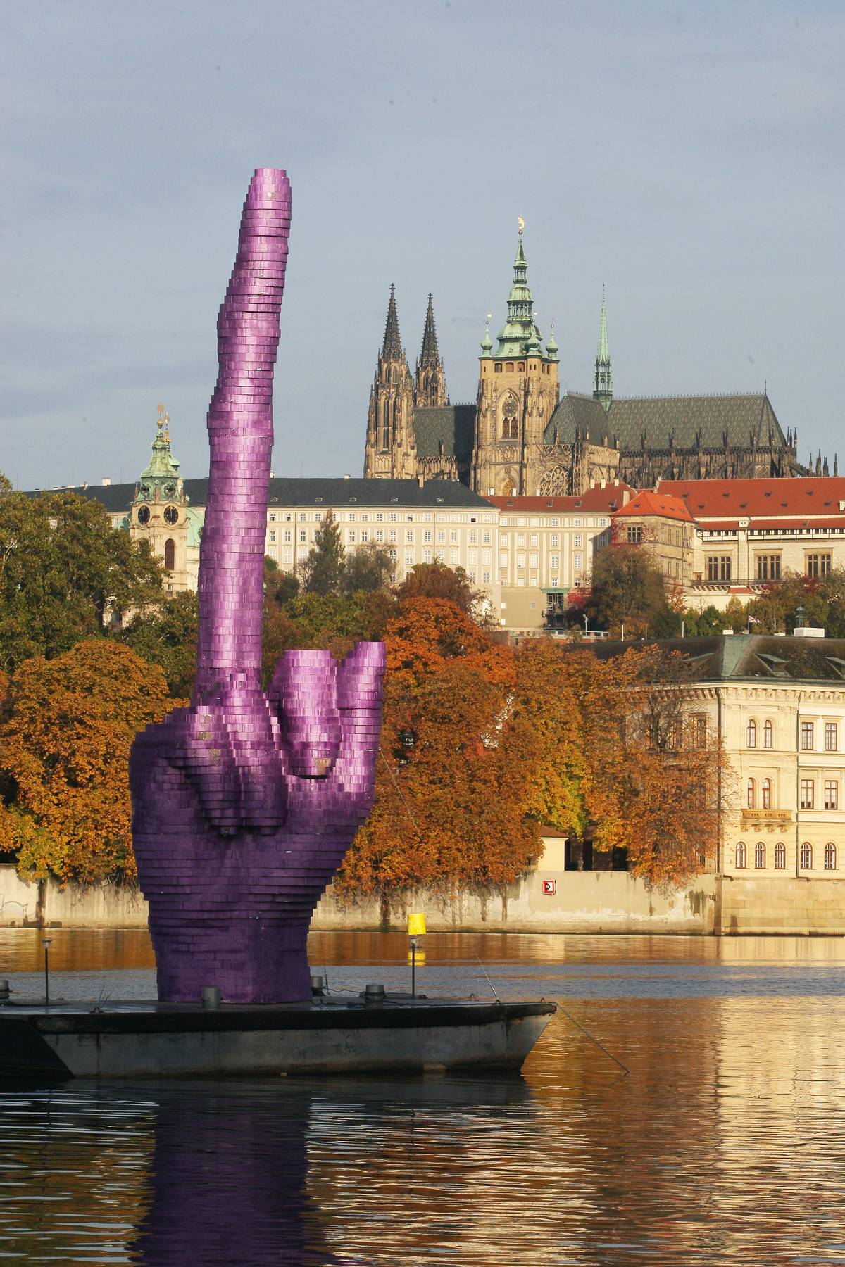 Zvednutý prostředníček směřující na Hrad. Plastika výtvarníka na Vltavě v době prezidentování Miloše Zemana