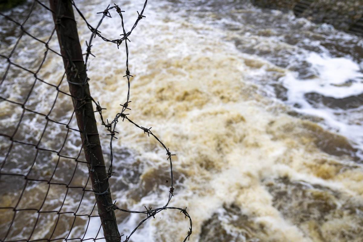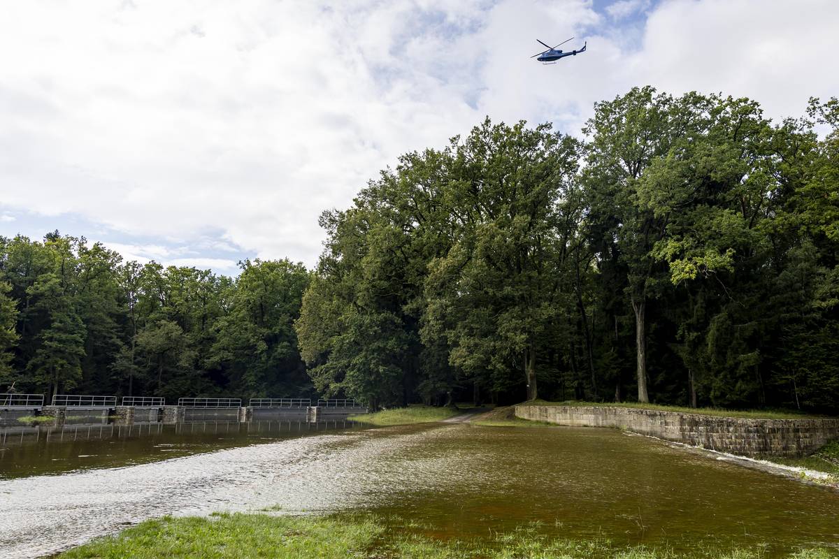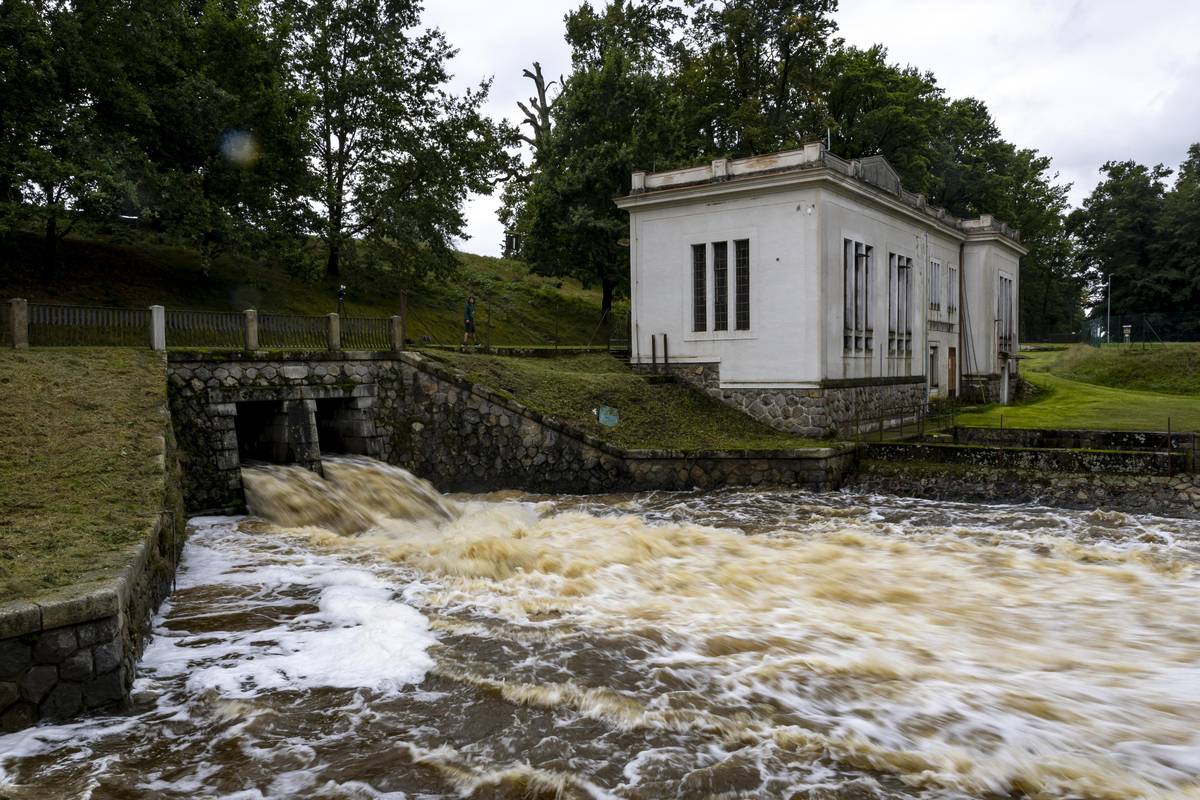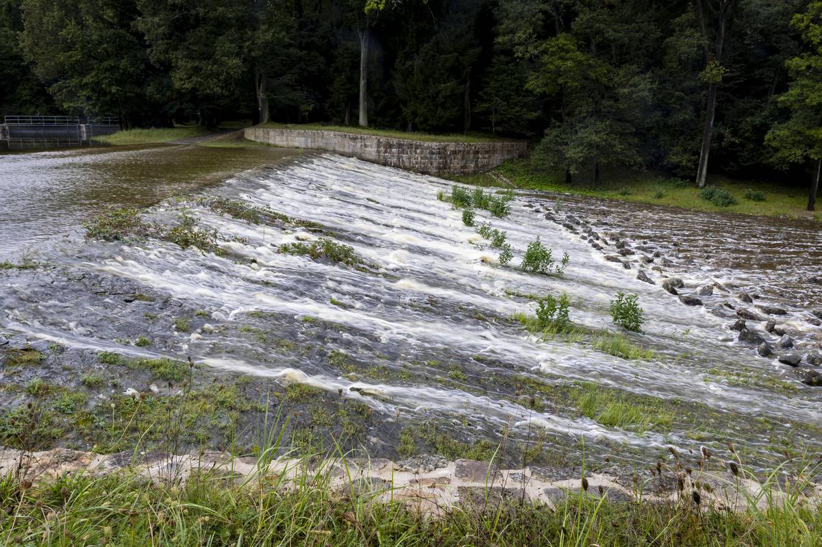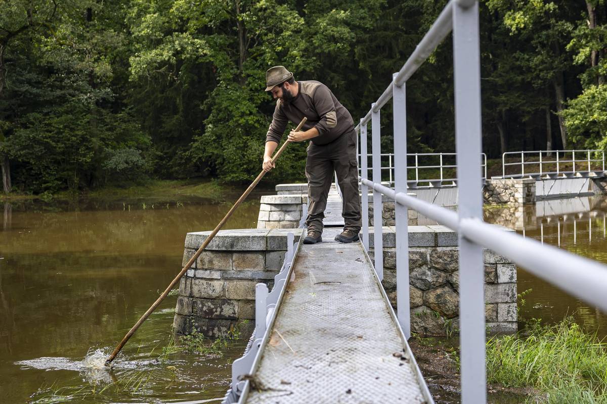 Rybáři kontrolují hráz bezpečnostního přelivu…