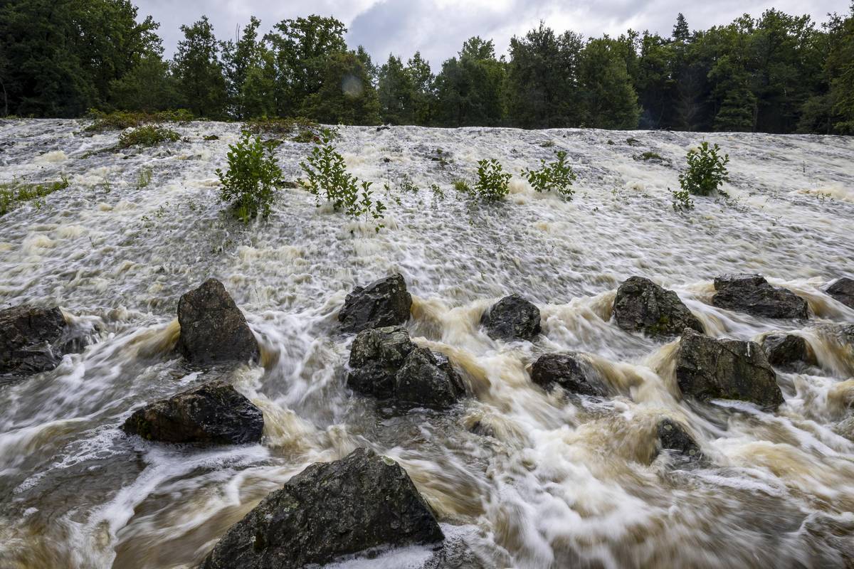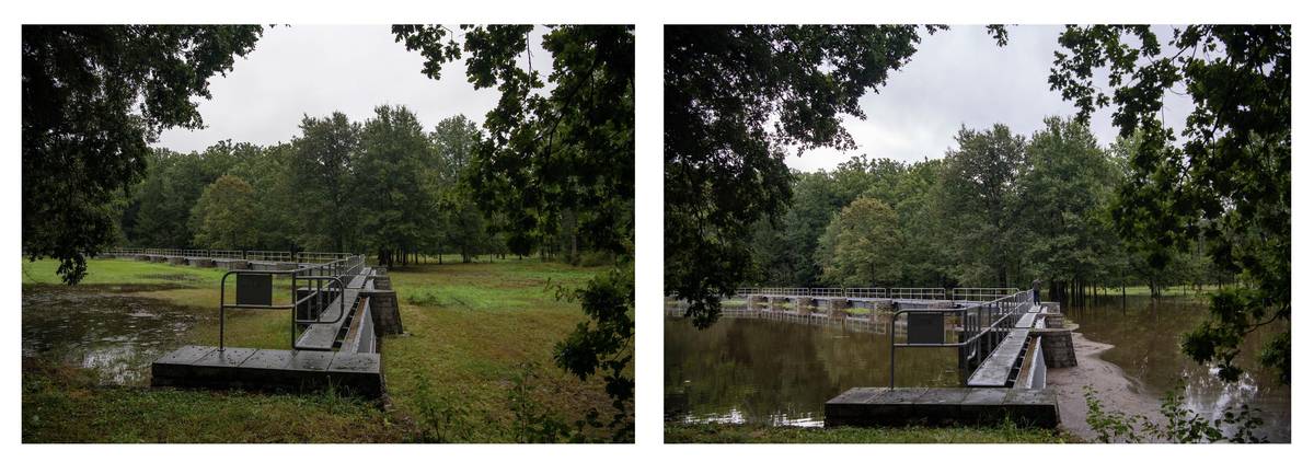 Bezpečnostní přeliv rybníku Rožmberk, kapacita se naplnila po extrémních deštích. Srovnávací foto na česlích jalového přepadu s rozdílem přibližně 24 hodin.