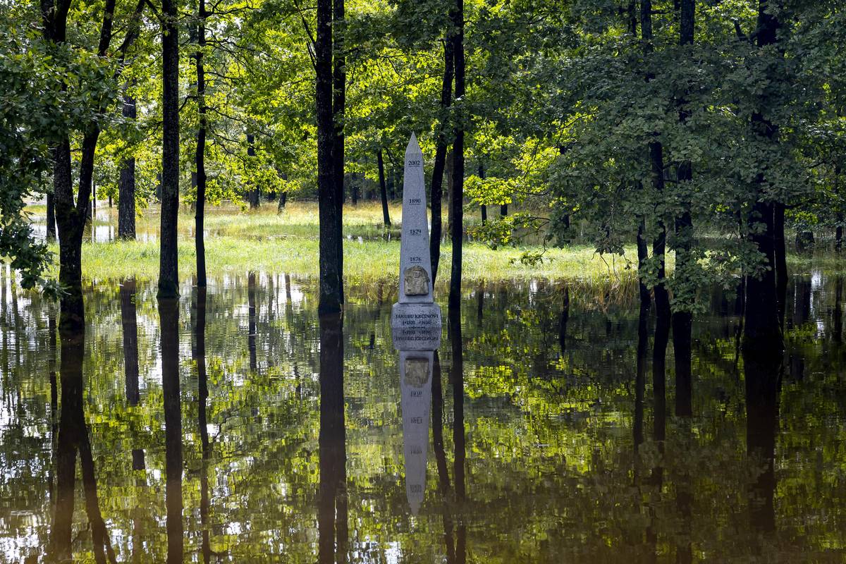 Pomník Jakuba Krčína, stavitele místních rybníků s vyznačením minulých povodní