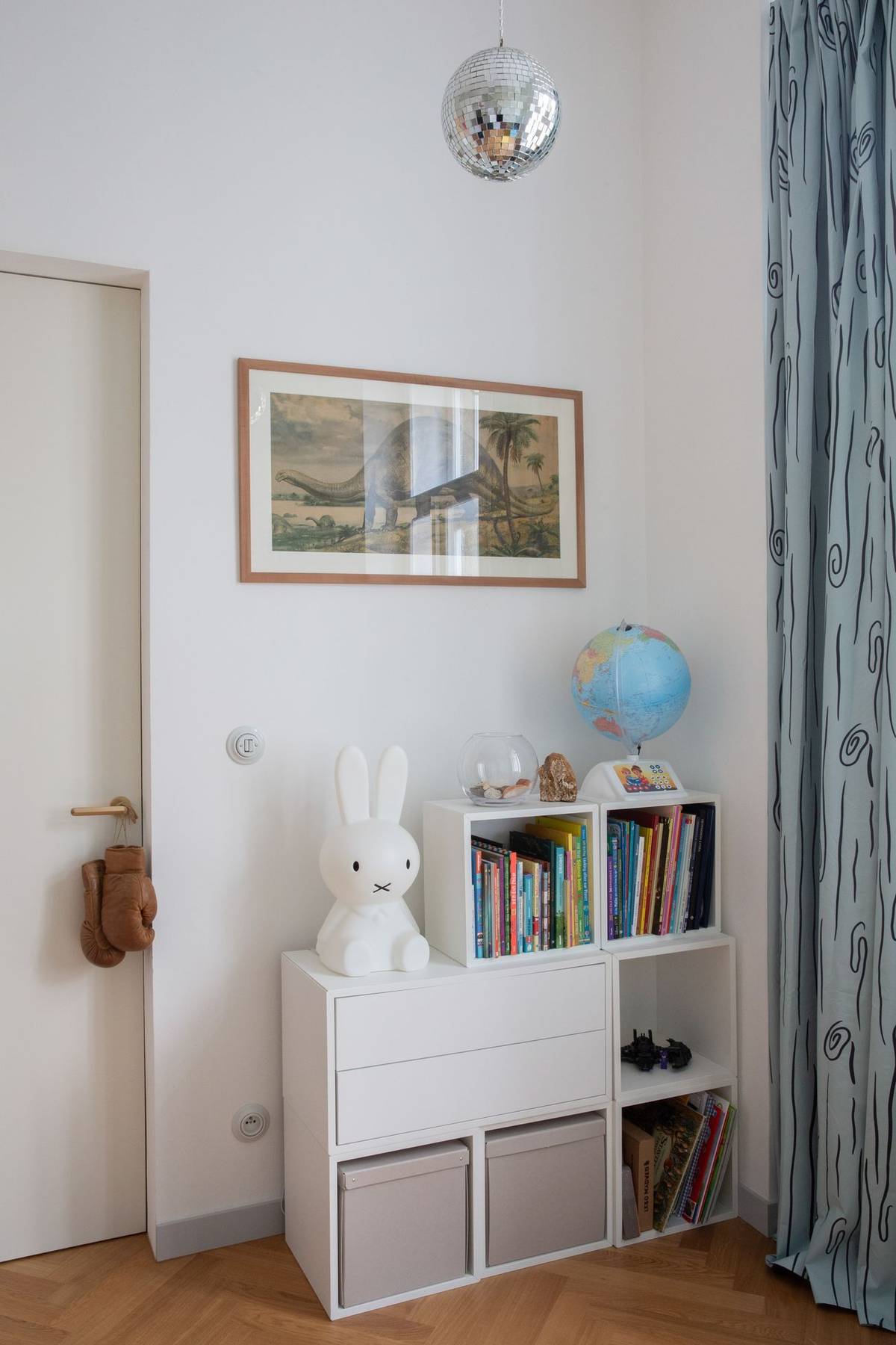 Je v něm nejméně vintage nábytku. Konkrétně je to pracovní stůl a doplňky jako zarámovaný plakát dinosaura od Zdeňka Buriana.