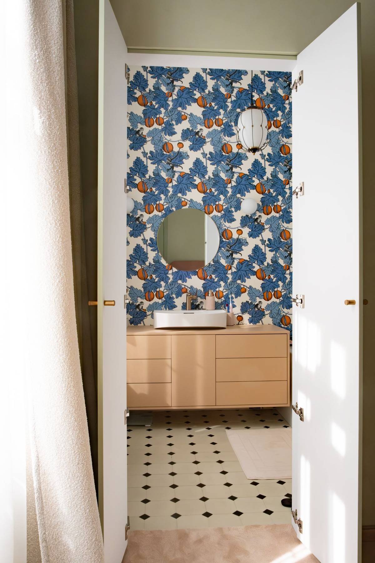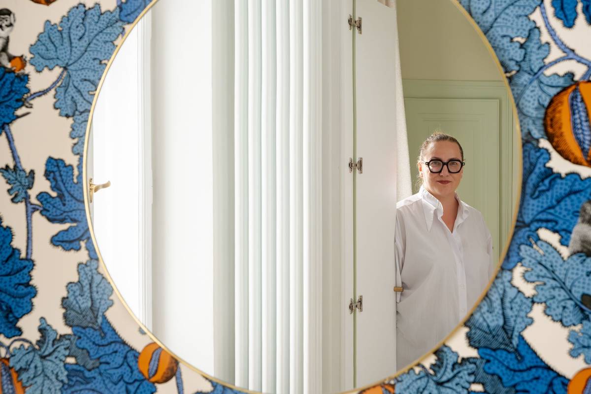 Motiv tapety Fornasetti je výrazný, a proto jsem ostatní prvky jako lampy nebo zrcadlo volila spíše jednodušší.