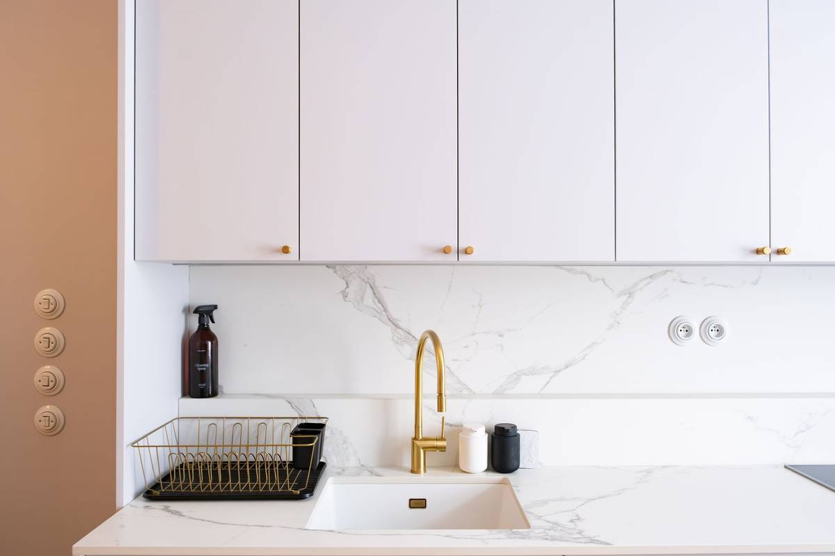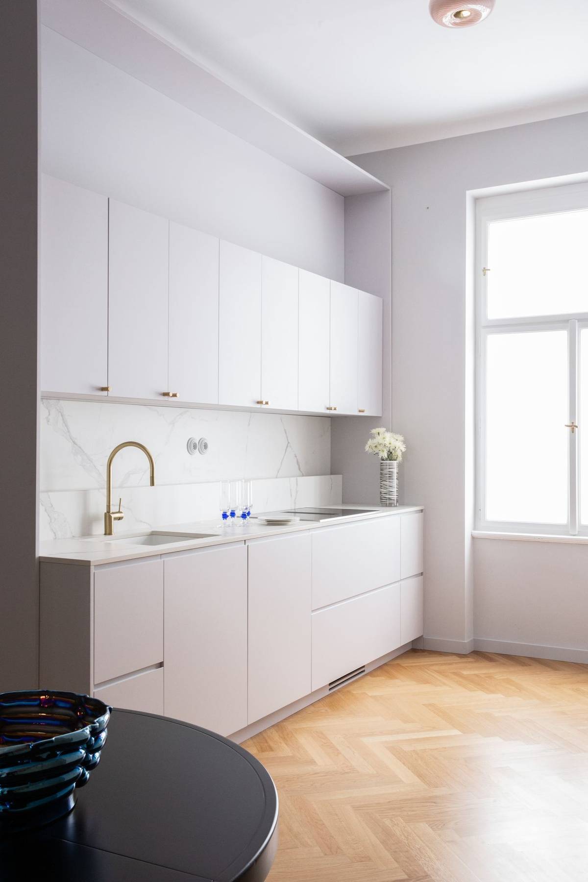 Všechny stěny, vestavěné skříně a kuchyně dostaly stejný odstín.