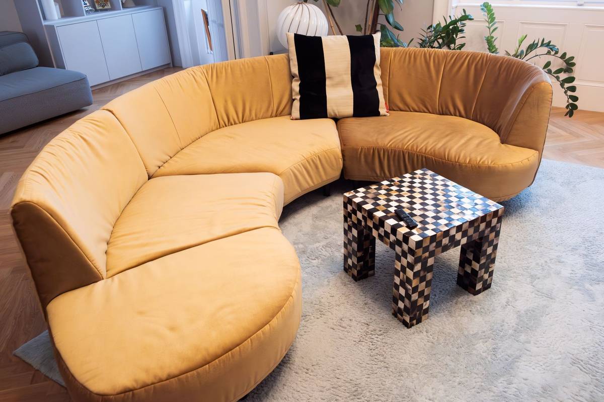 Časem jsme s manželem pohovku vyměnili, abychom se na ni všichni pohodlně vešli. Organický tvar vintage sedačky se vidí málokde, je navíc poměrně hluboká.