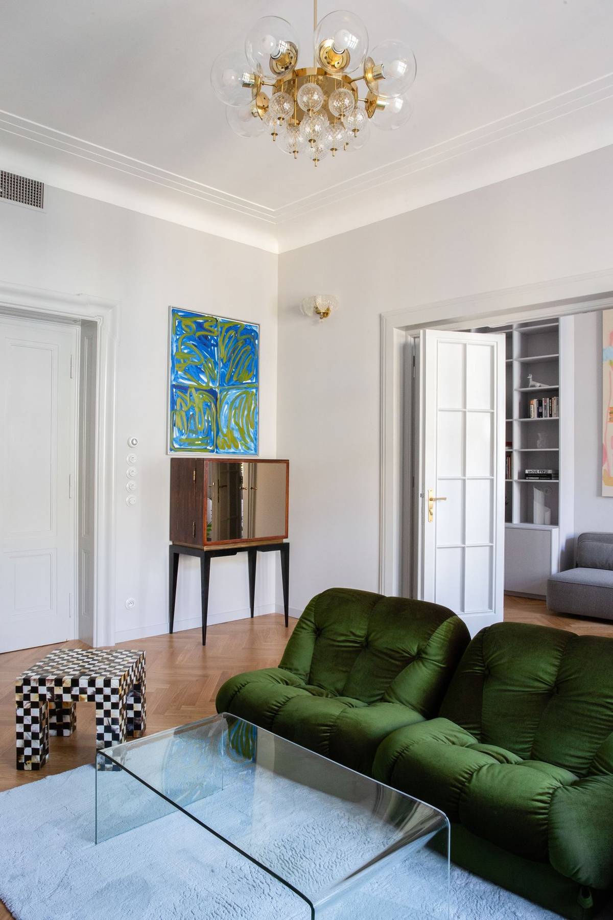 Jako první jsem do bytu vybrala sedačku, která dva roky čekala na své využití. Pochází ze 70. let minulého století a nechala jsem ji přečalounit do zeleného sametu.