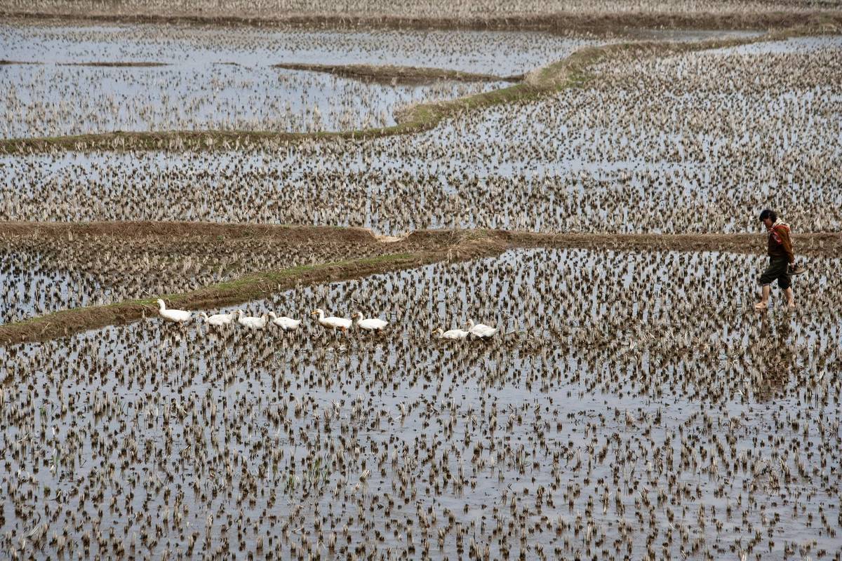Rýžová pole cestou od čínské hranice do Pchjongjangu