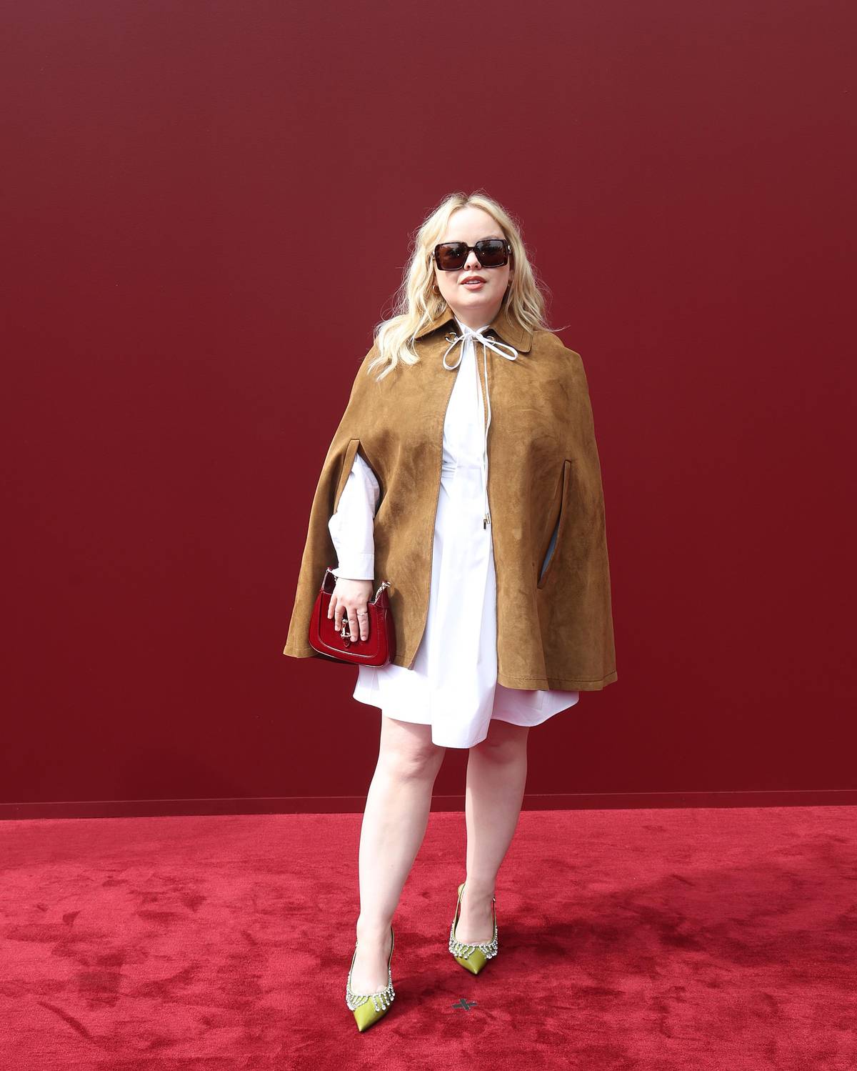 Herečka Nicola Coughlan z Bridgertonových zkombinovala bílé mini šaty se semišovou pelerínou