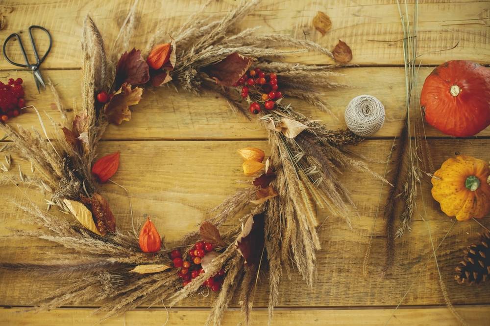 Sušené traviny seženete v každém květinářství, stejně jako oranžové mochyně. I když si budete věnec vyrábět sami, pro ušetření času se vyplatí si materiál nakoupit