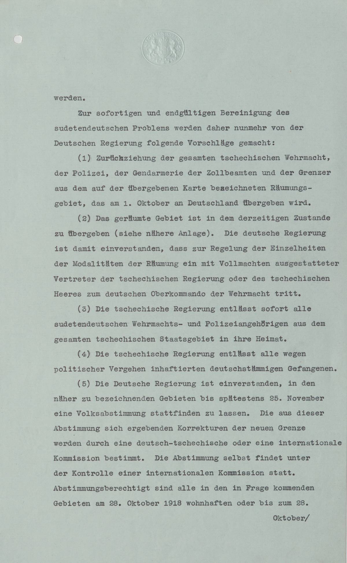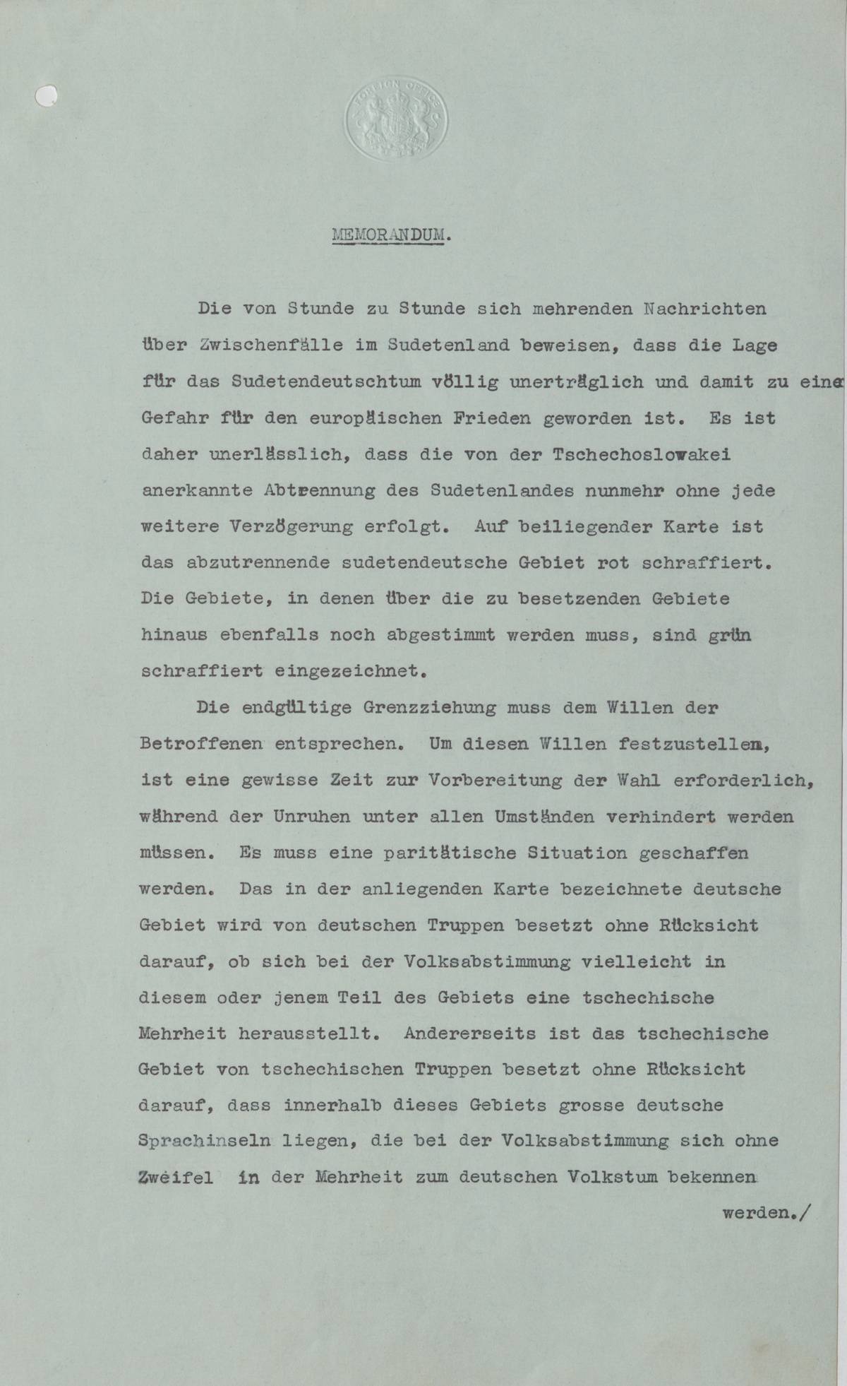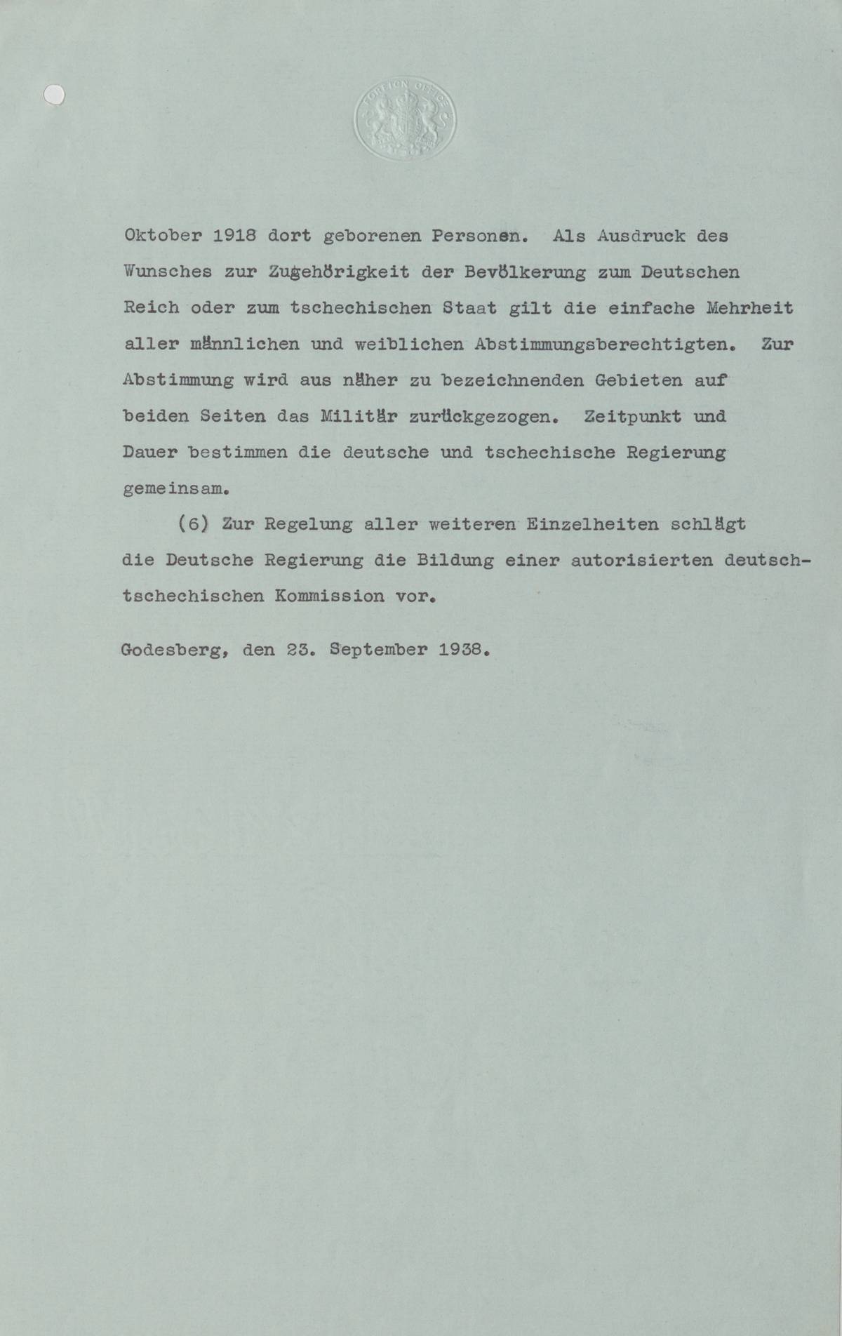 Hitlerovo godesberské memorandum shrnující německé požadavky vůči Československu ke dni 23.9., jak byly Hitlerem předloženy Chamberlainovi v průběhu godesberských jednání.