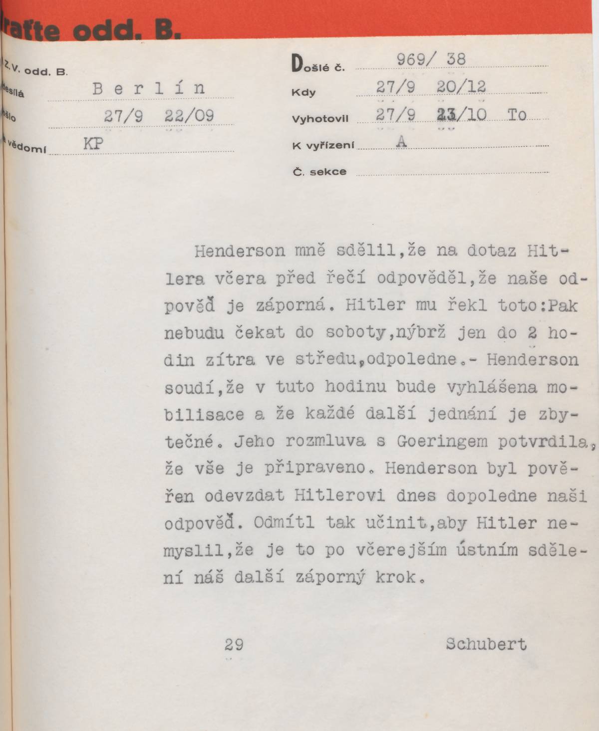 Telegram zástupce československého vyslance v Berlíně Miroslava Schuberta o rozhovoru s britským velvyslancem v Berlíně Nevilem Hendersonem, ve kterém jej britský velvyslanec informuje o svém rozhovoru s Hitlerem. V tomto rozhovoru požadoval Hitler splnění jeho požadavků do 28.9. do 14.00 hodin.
