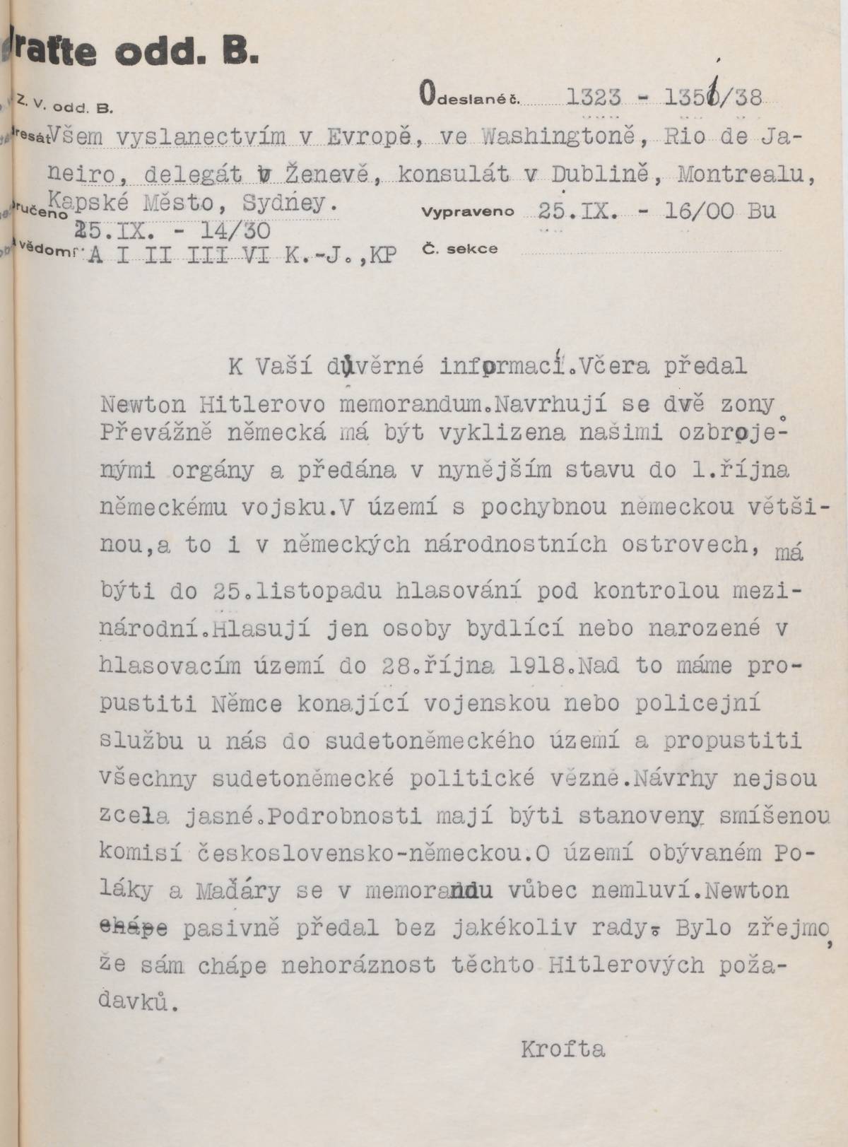 Telegram ministra zahraničních věcí Kamila Krofty informující československé zastupitelské úřady v zahraničí o obsahu Hitlerova godesberského memoranda (25.9.1938).