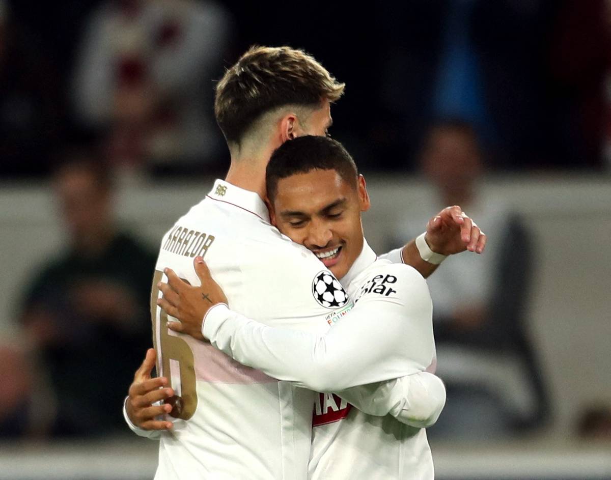 Fotbalisté Stuttgartu se radují z úvodní branky utkání.