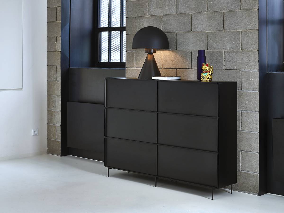 Komoda Cabinet One má drážky vyfrézované do dřeva a slouží jako vodiče pro elegantní kovová dvířka.
