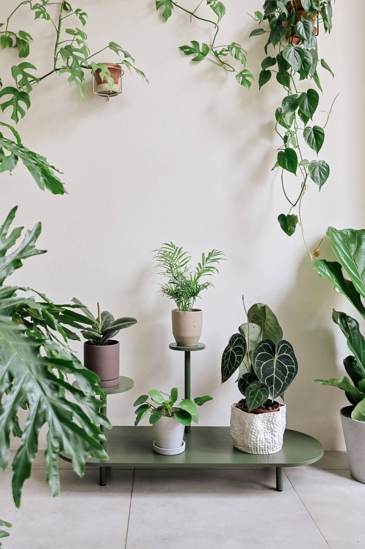Minimalistický stolek na květiny Oasis je oázou pro pokojovky. Ručně kartáčovaná lakovaná dýha na překližce je odolná vůči vodě.