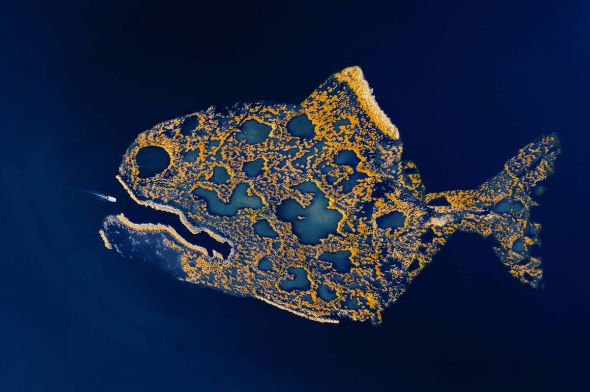 Serdar Aydin (Turecko): Piraňa. Pohled z výšky na jednu z formací v oblasti Dalyan, do které vplouvá loď. Uznání poroty v kategorii Příroda a krajina.
