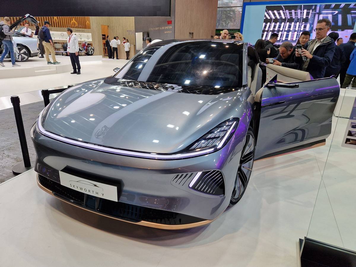 Neznámá značky Skyworth prezentuje celé portfolio modelů, hodně pozornosti poutá showcar CE11 s proti sobě se otevírajícími dveřmi.