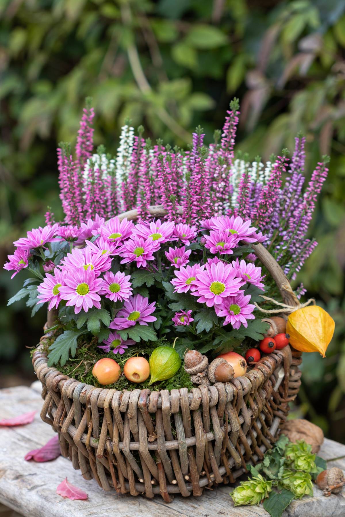Vřesu to svědčí v přírodních materiálech, osázet jím můžete třeba starý košík nebo ošatku. Společnost barevně ladících chryzantém dodá ještě víc zářivosti