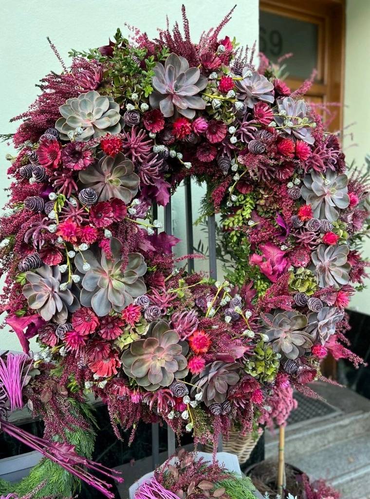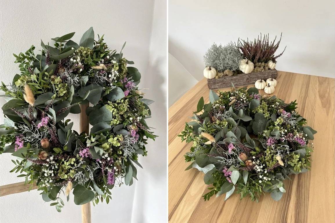Věnec je vyroben z eukalyptu, pistacie, buxusu. Je doplněn hortenzií, vřesem a drátovcem a bude luxusní dekorací na vchodové dveře nebo do bytu. V e-shopu Design by dub (průměr 40-45 cm) za 1 390 Kč