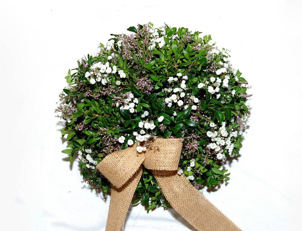 Vypichovaná koule může posloužit jako dárek nebo svatební výzdoba. Je vyrobená z vřesu, gypsophily a buxusu. Koupíte ji v e-shopu Květiny Maják za 1 390 Kč