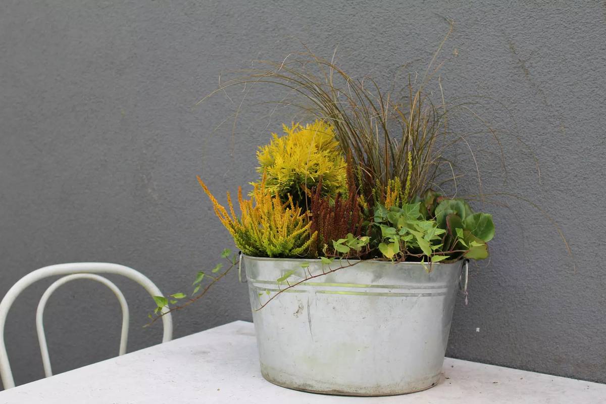 Zahradnictví Flos nabízí zajímavě barevně laděnou inspiraci - plechovou nádobu osázenou třemi druhy vřesu, břečťanem, bergénií, zimolezem, ostřicí a tújí