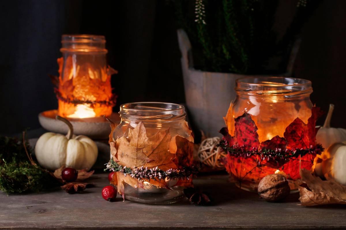 Ke chvílím, kdy je už venku tma, se hodí svícen ze zavařovačky, který je dekorován podzimním listím a má detaily právě z vřesových větviček